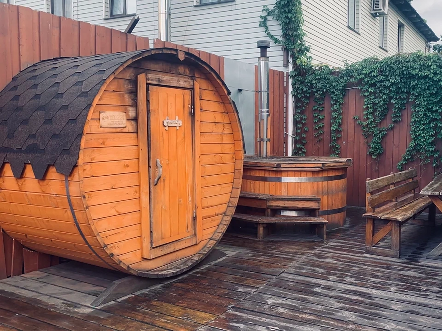 Кедровая бочка — компромисс между экзотикой и функциональностью. «Это большая парилка в виде бочки, которая положена на бок. Она сделана из кедра, стянута кольцами. Смысл в том, что пар распределяется интересно — она круглая, и когда начинаешь махать веником, он очень равномерно распределяется», — описывает Дмитрий техническую сторону.