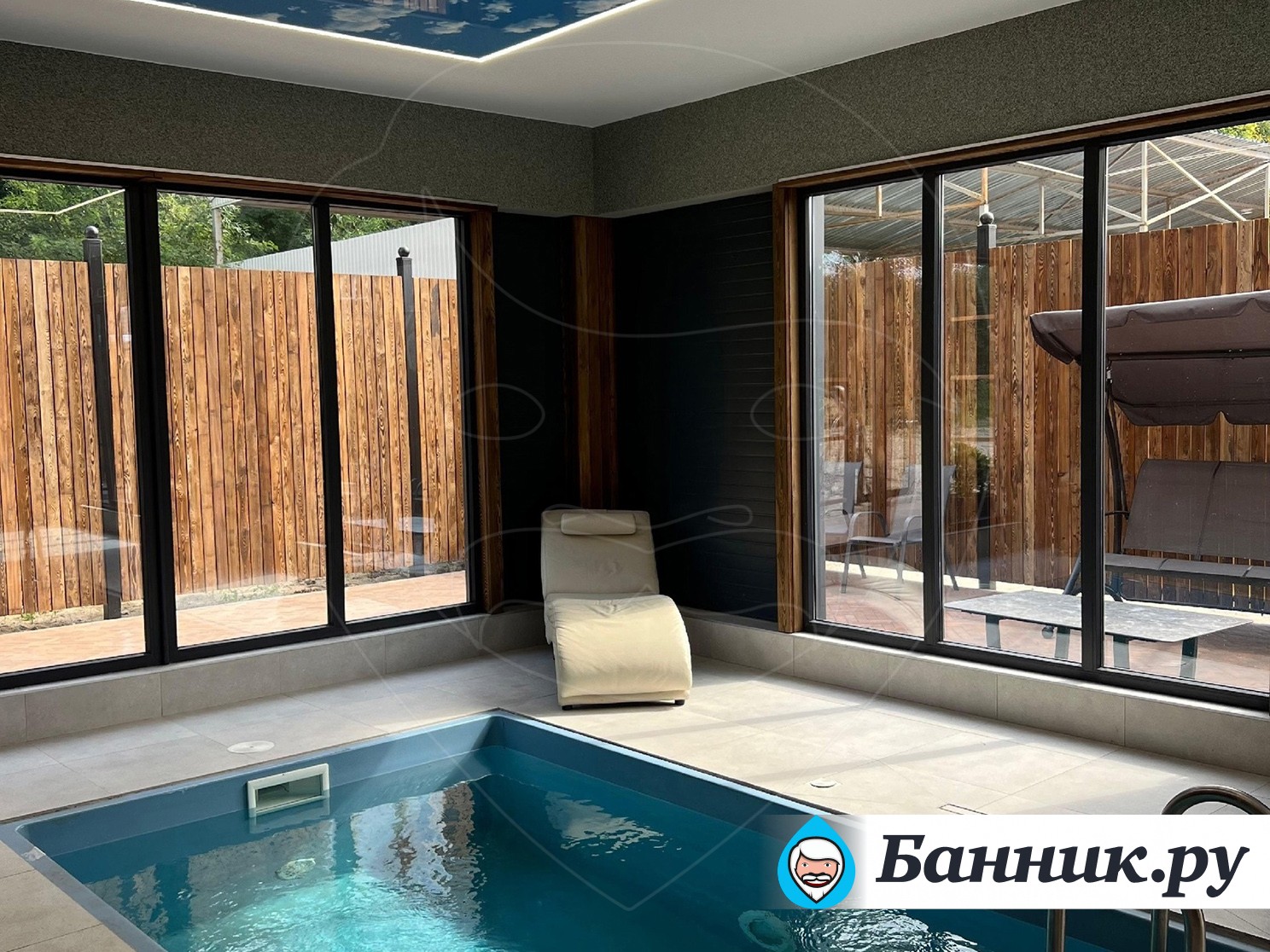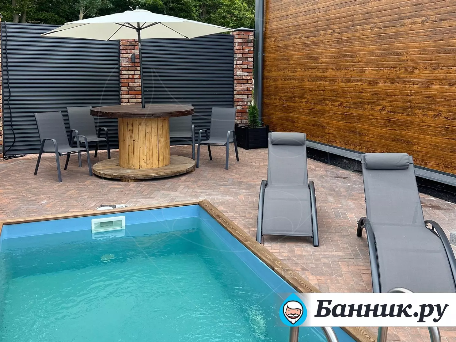 Если хочется простора и света, ваша история — «Хрустальная». Здесь просторно для компании до восьми человек, а главной фишкой стал теплый уличный бассейн… но не простой, а с настоящей морской водой. Представьте, как вы выходите из парной и окунаетесь в морскую прохладу.