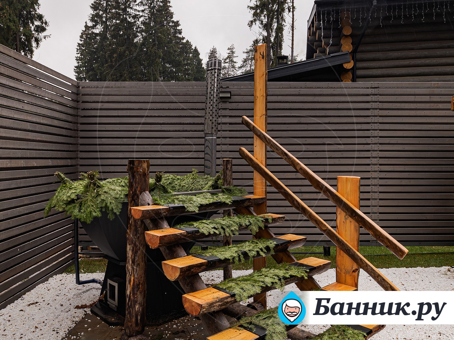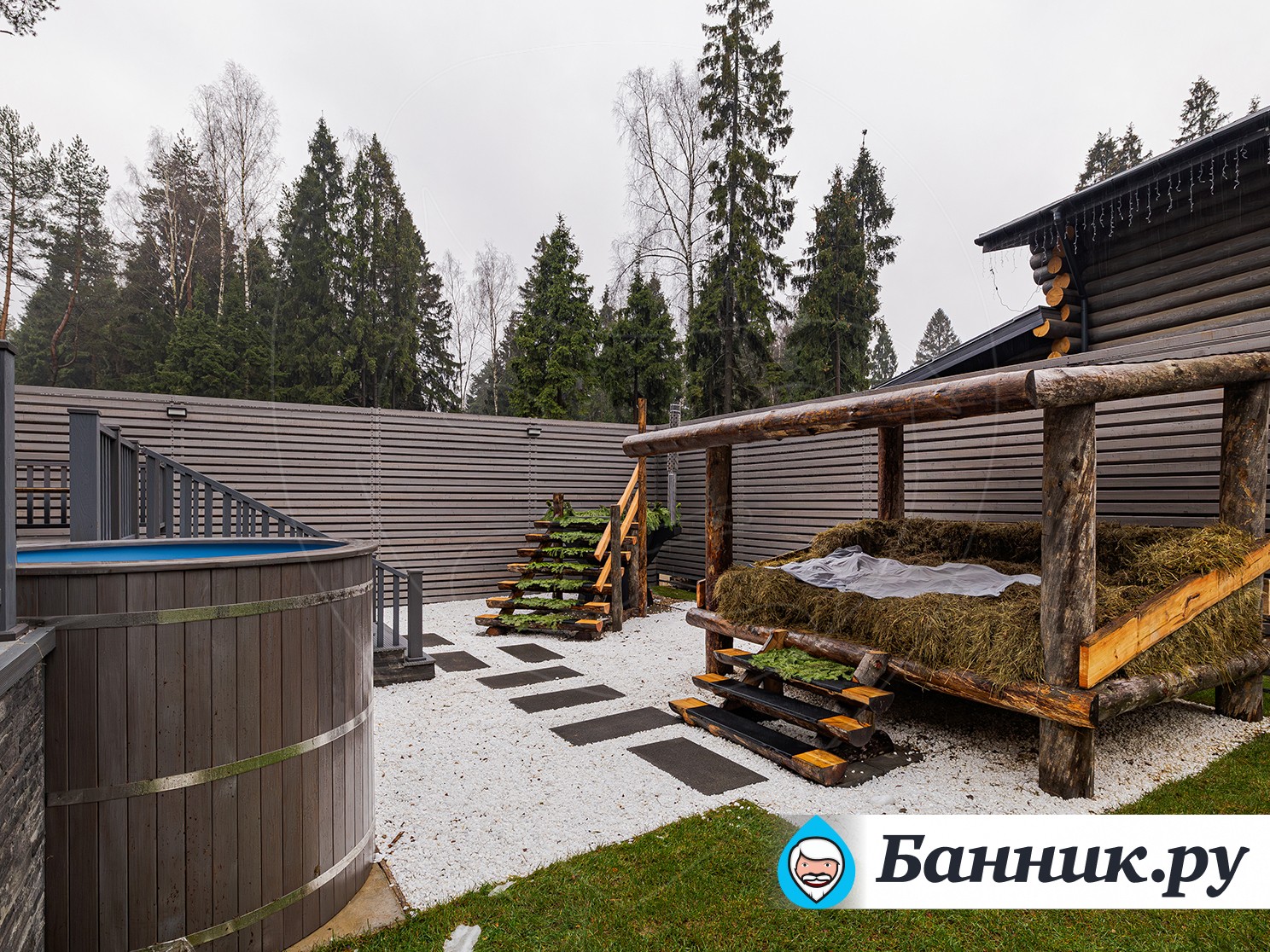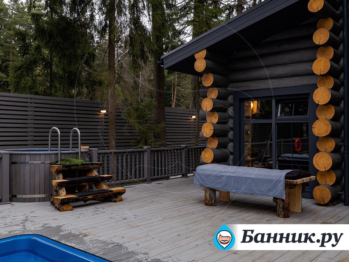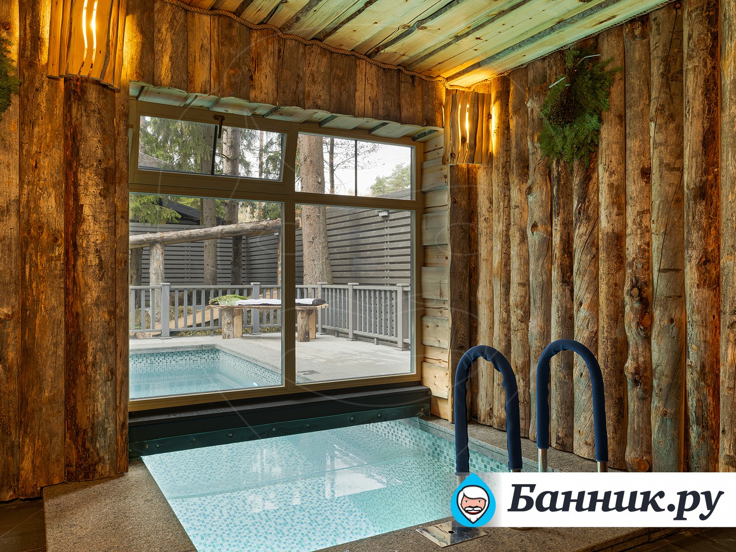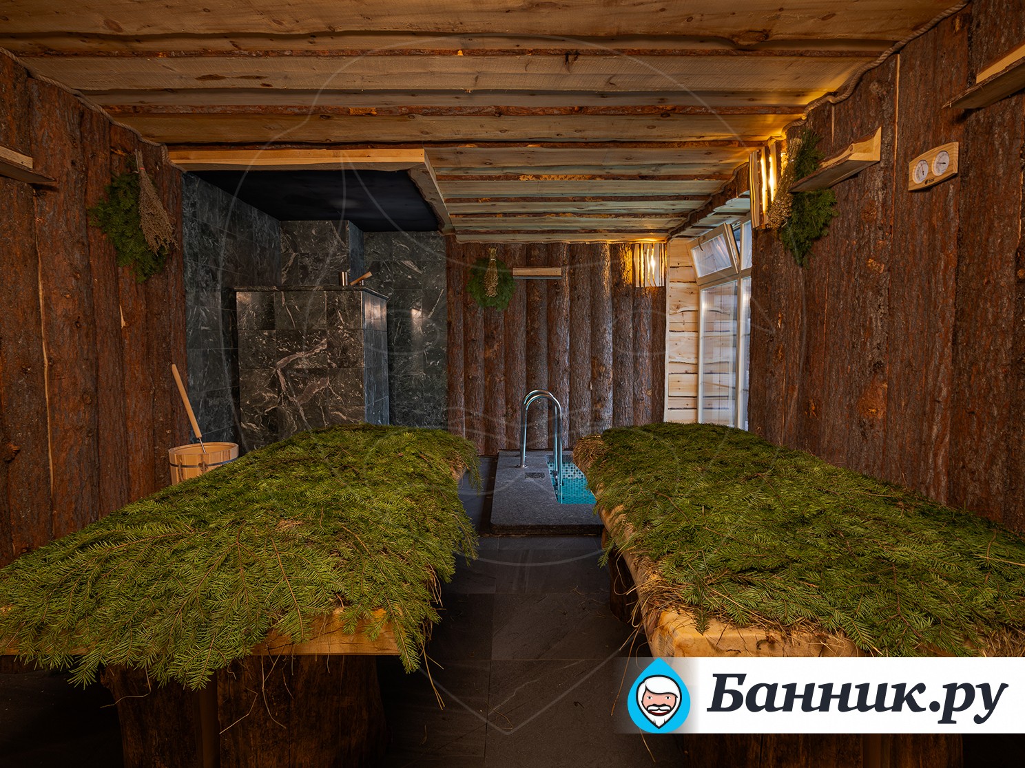 Баня выполнена из кело — уникальной северной древесины, которая отлично сохраняет тепло и создаёт атмосферу уюта. Среди банных удобств — соляная комната, чан, купель и уличный бассейн.