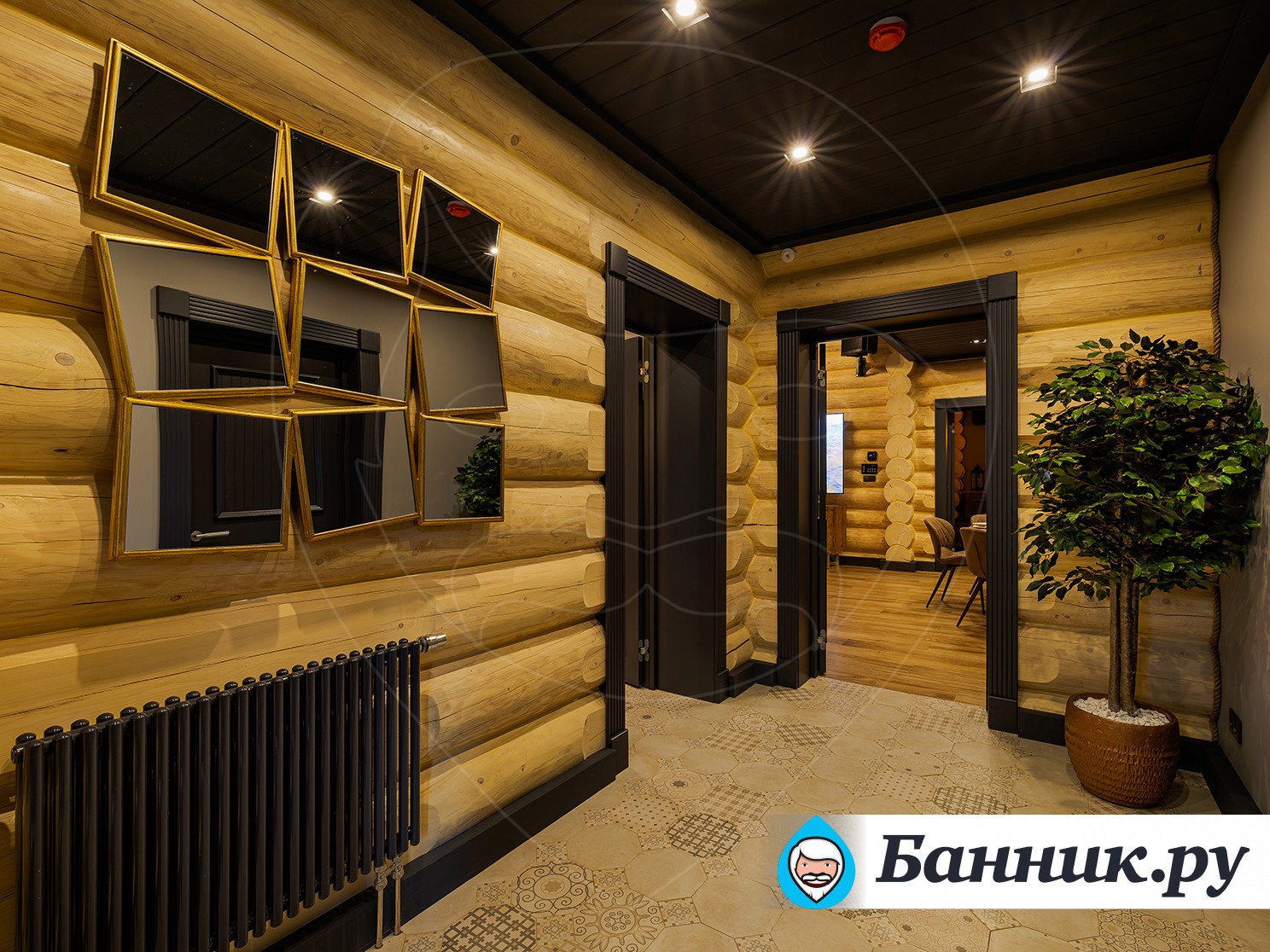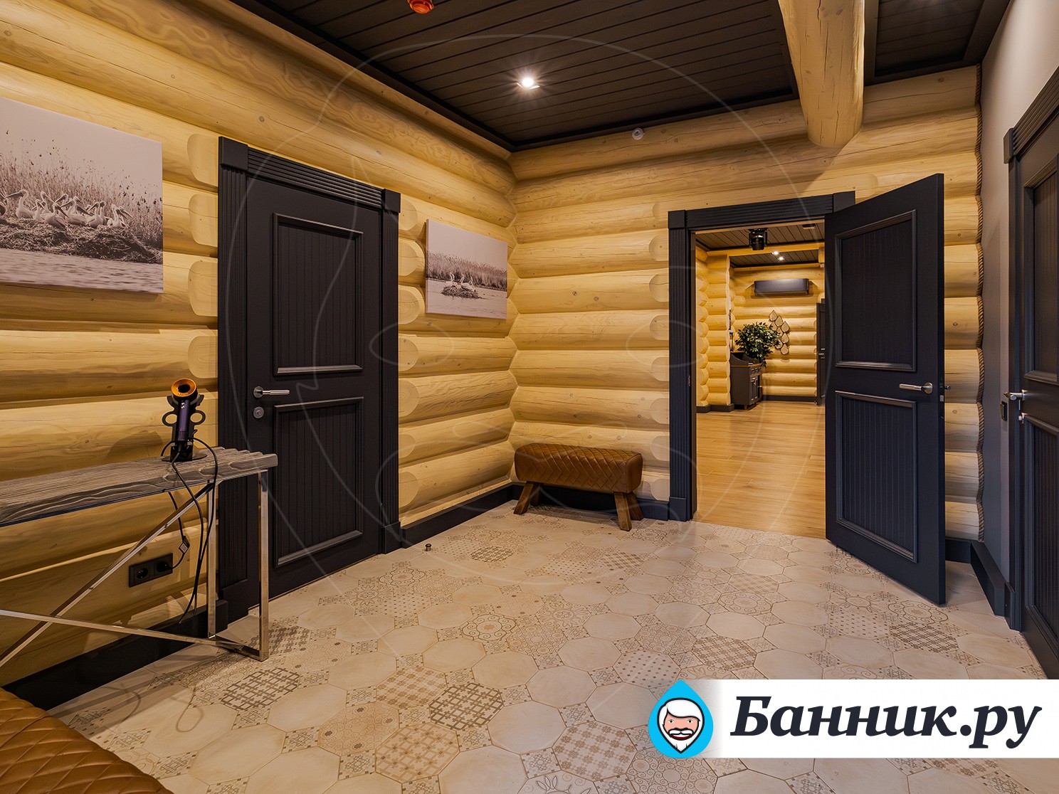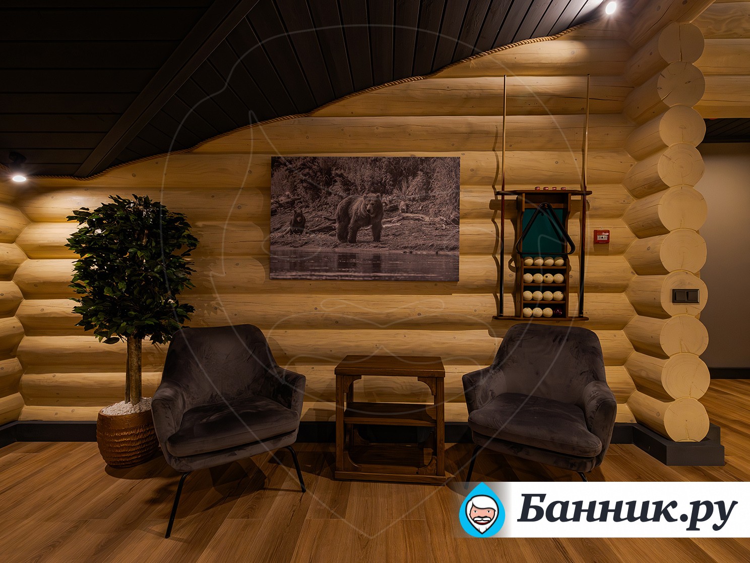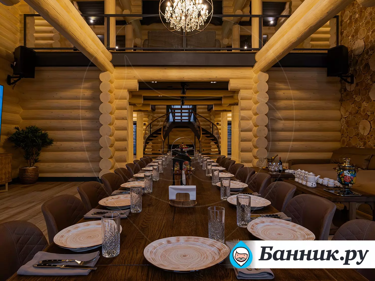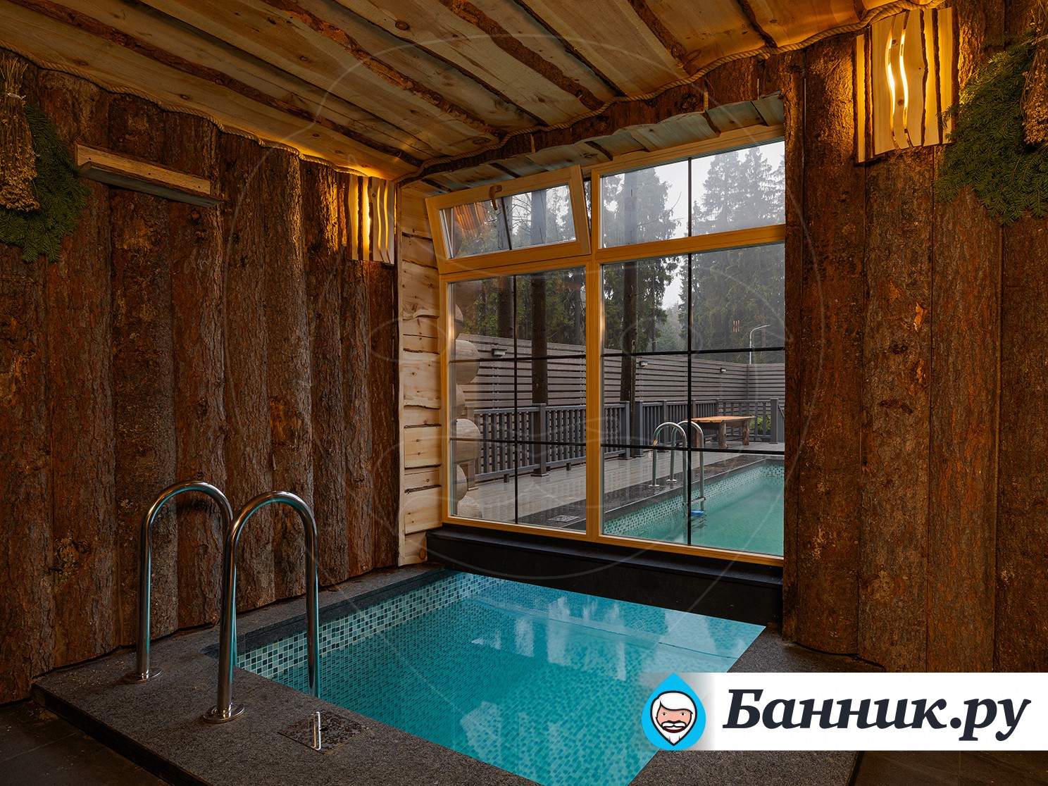 Баня выполнена из кело — уникальной северной древесины, которая отлично сохраняет тепло и создаёт атмосферу уюта. Среди банных удобств — соляная комната, чан, купель и уличный бассейн.
