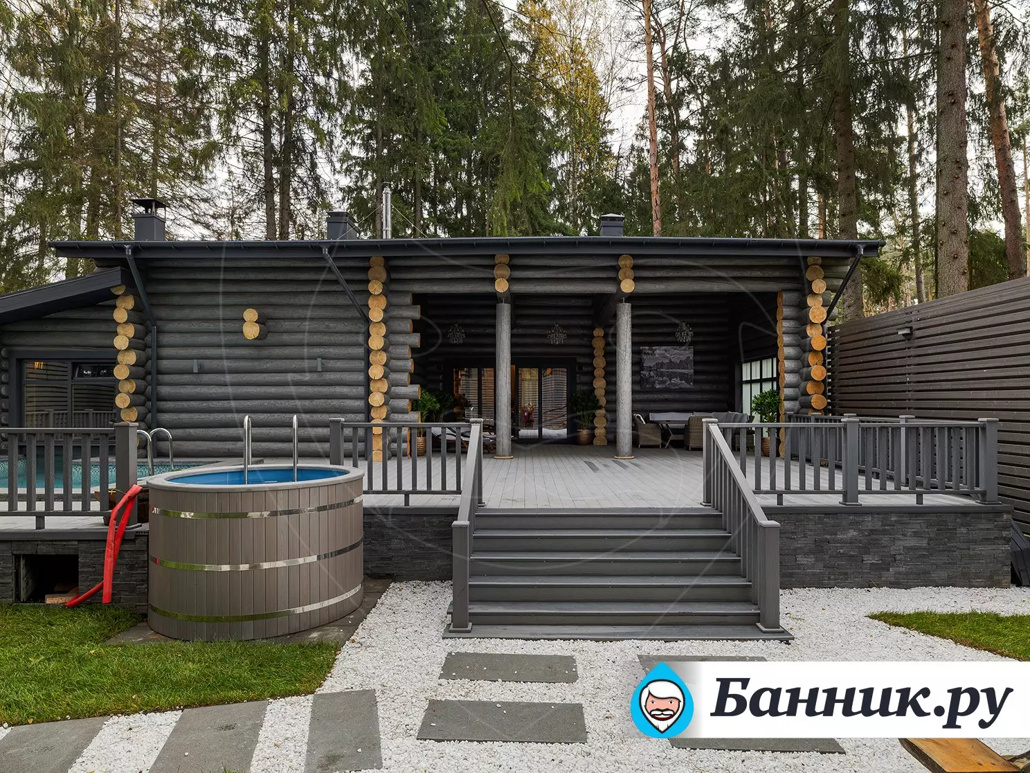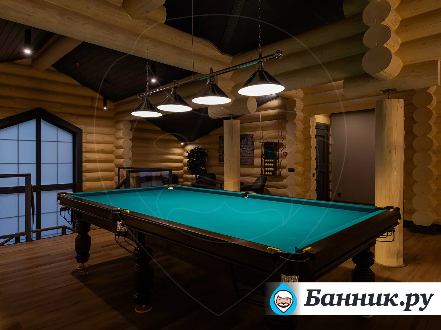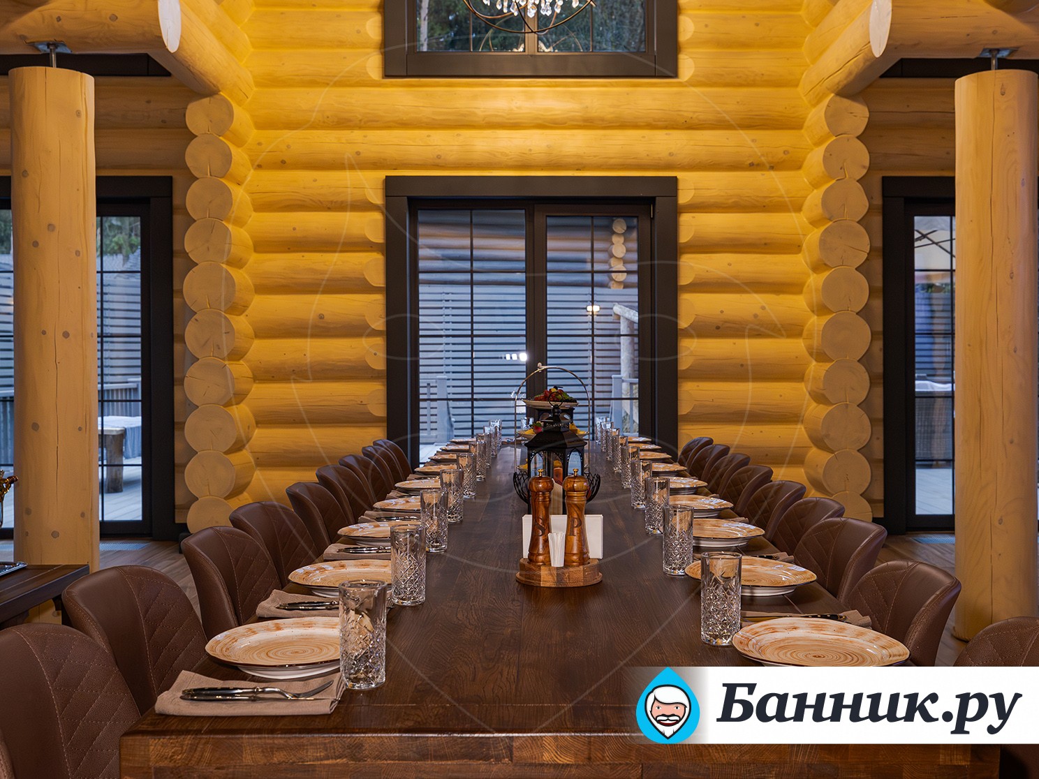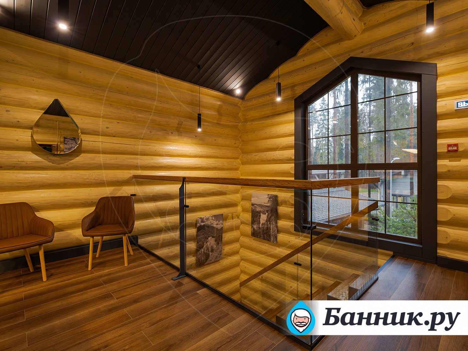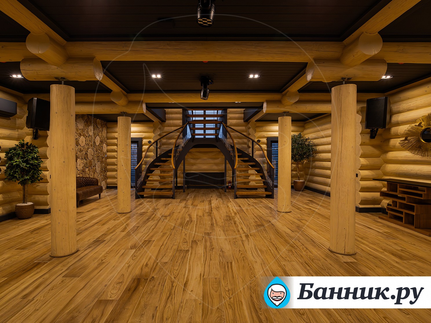 Баня выполнена из кело — уникальной северной древесины, которая отлично сохраняет тепло и создаёт атмосферу уюта. Среди банных удобств — соляная комната, чан, купель и уличный бассейн.
