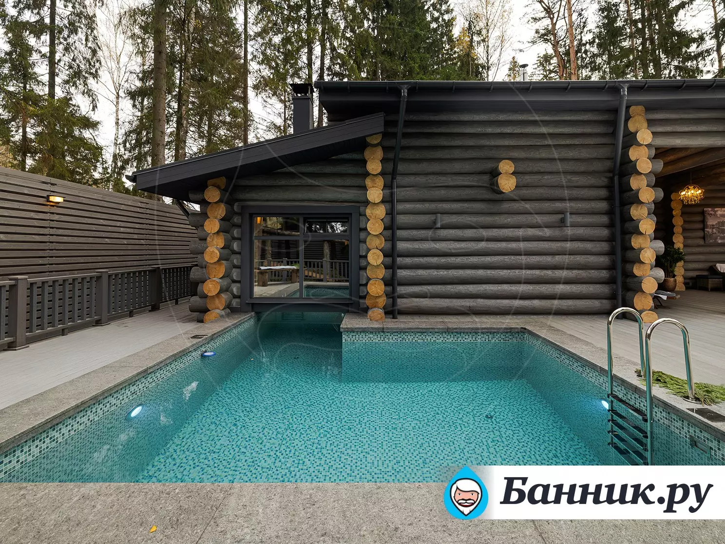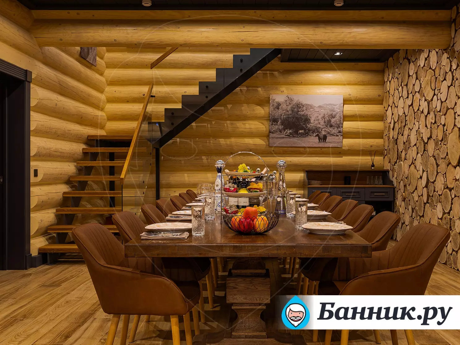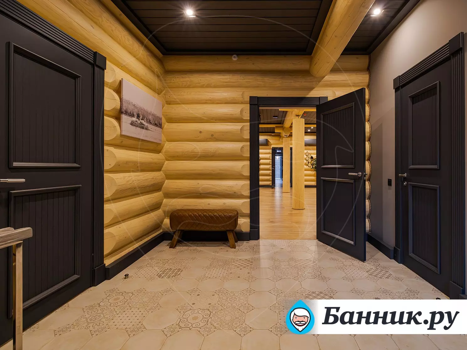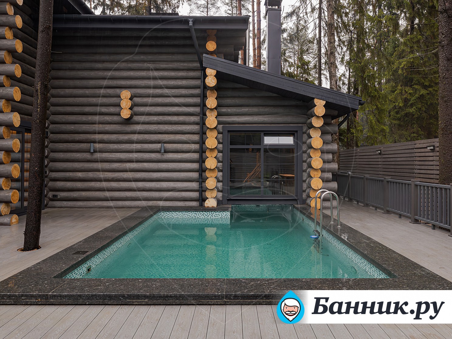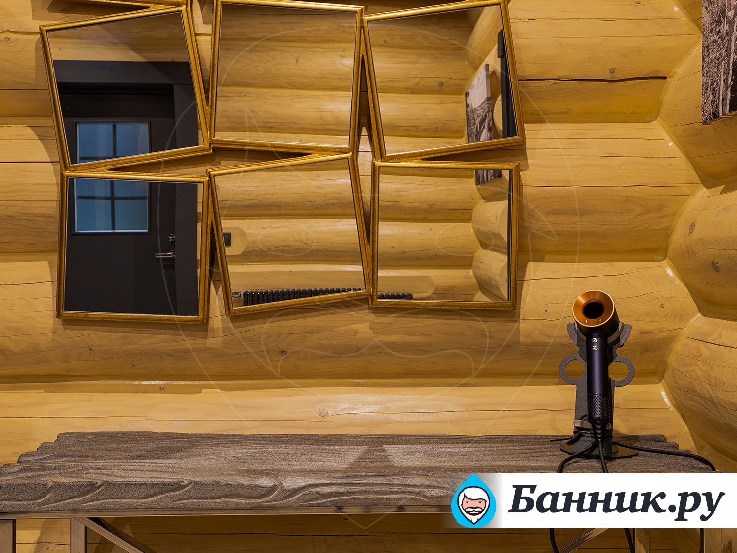 Баня выполнена из кело — уникальной северной древесины, которая отлично сохраняет тепло и создаёт атмосферу уюта. Среди банных удобств — соляная комната, чан, купель и уличный бассейн.