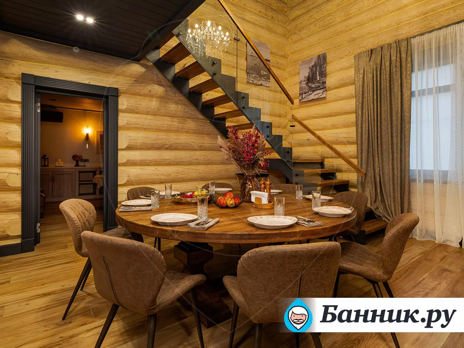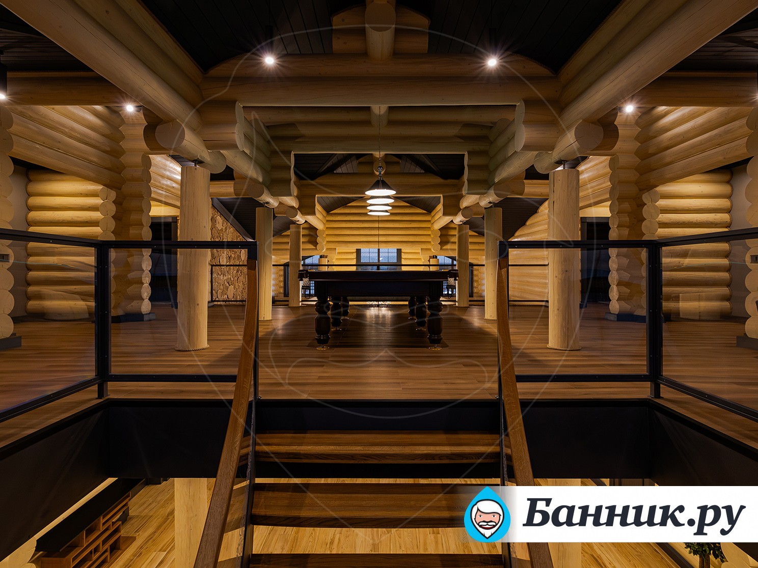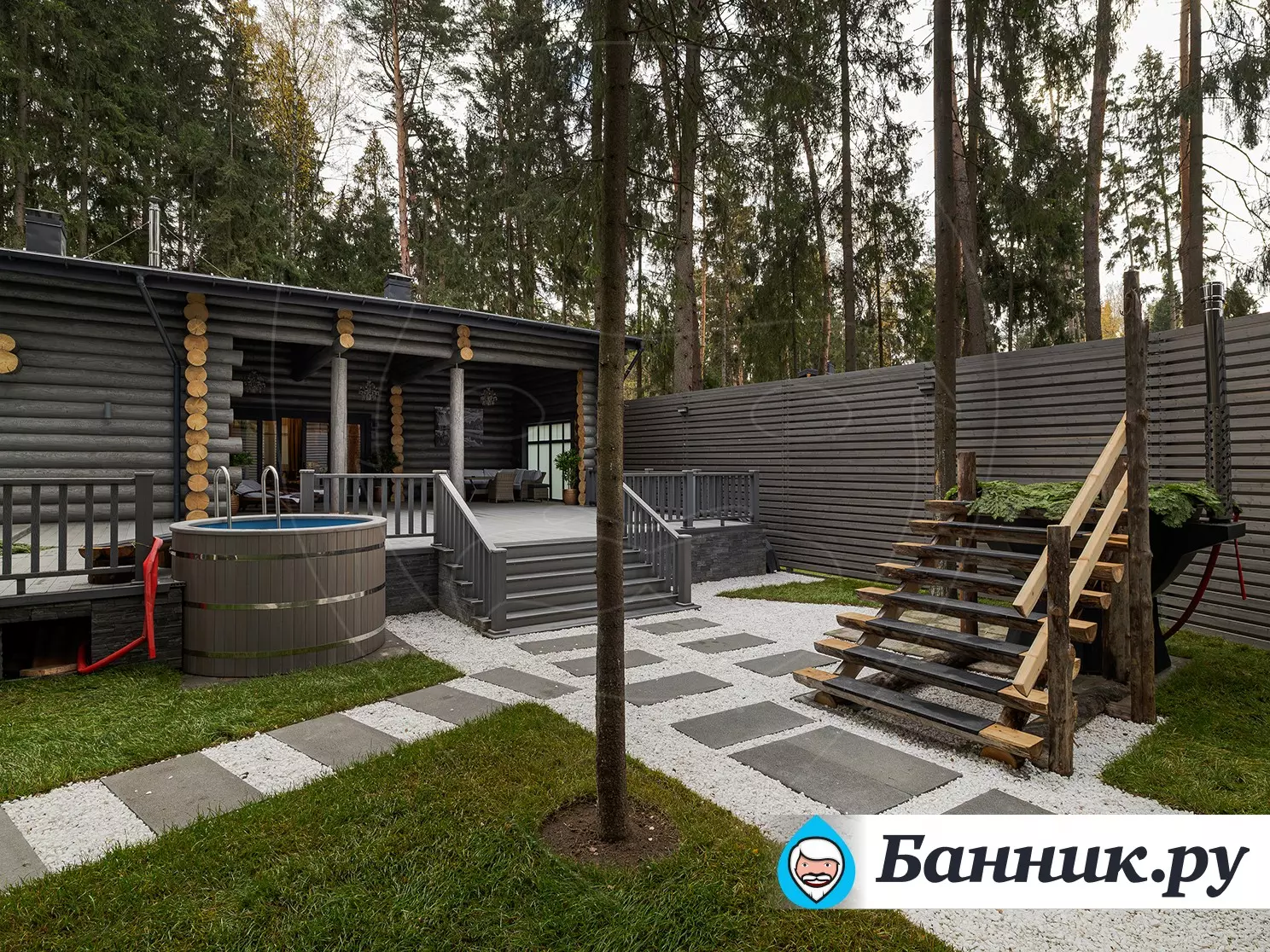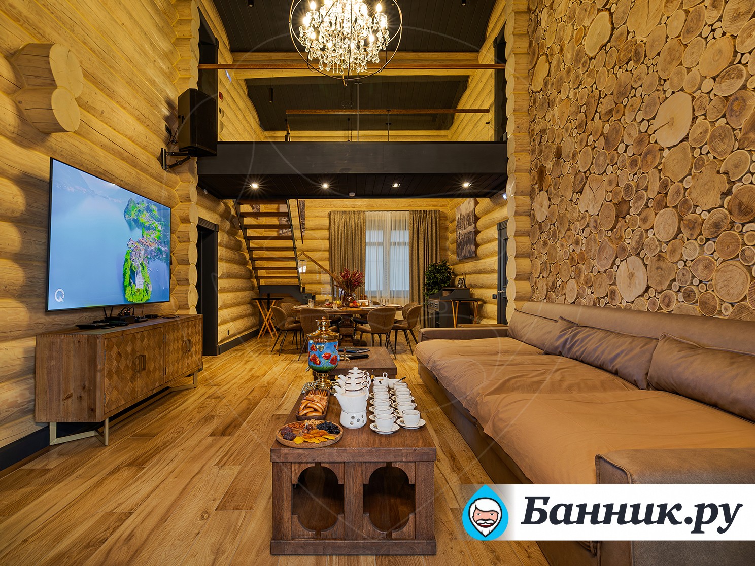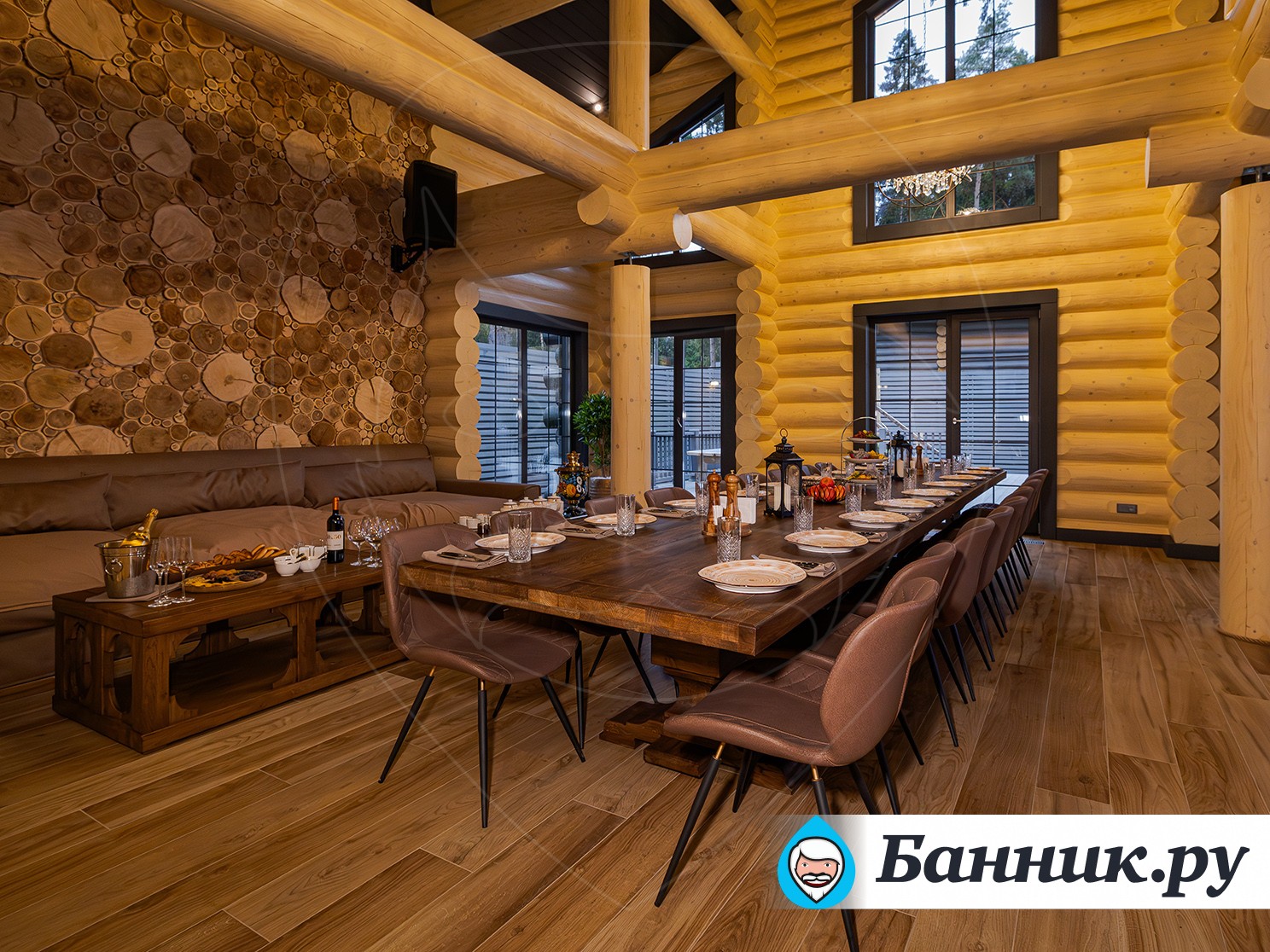 Баня выполнена из кело — уникальной северной древесины, которая отлично сохраняет тепло и создаёт атмосферу уюта. Среди банных удобств — соляная комната, чан, купель и уличный бассейн.