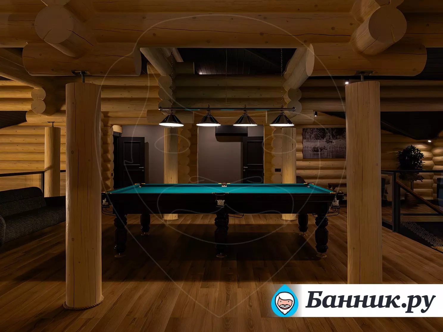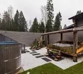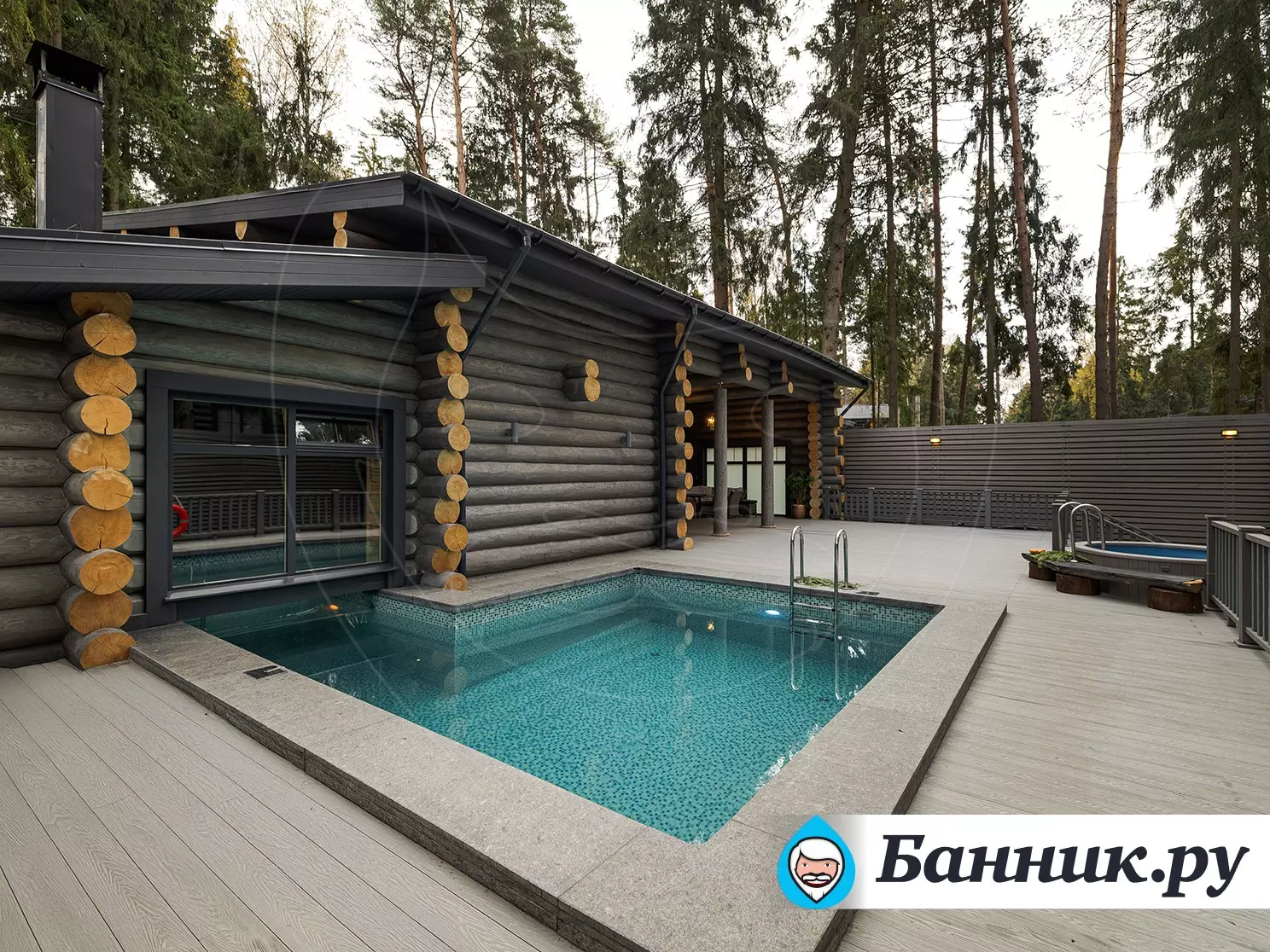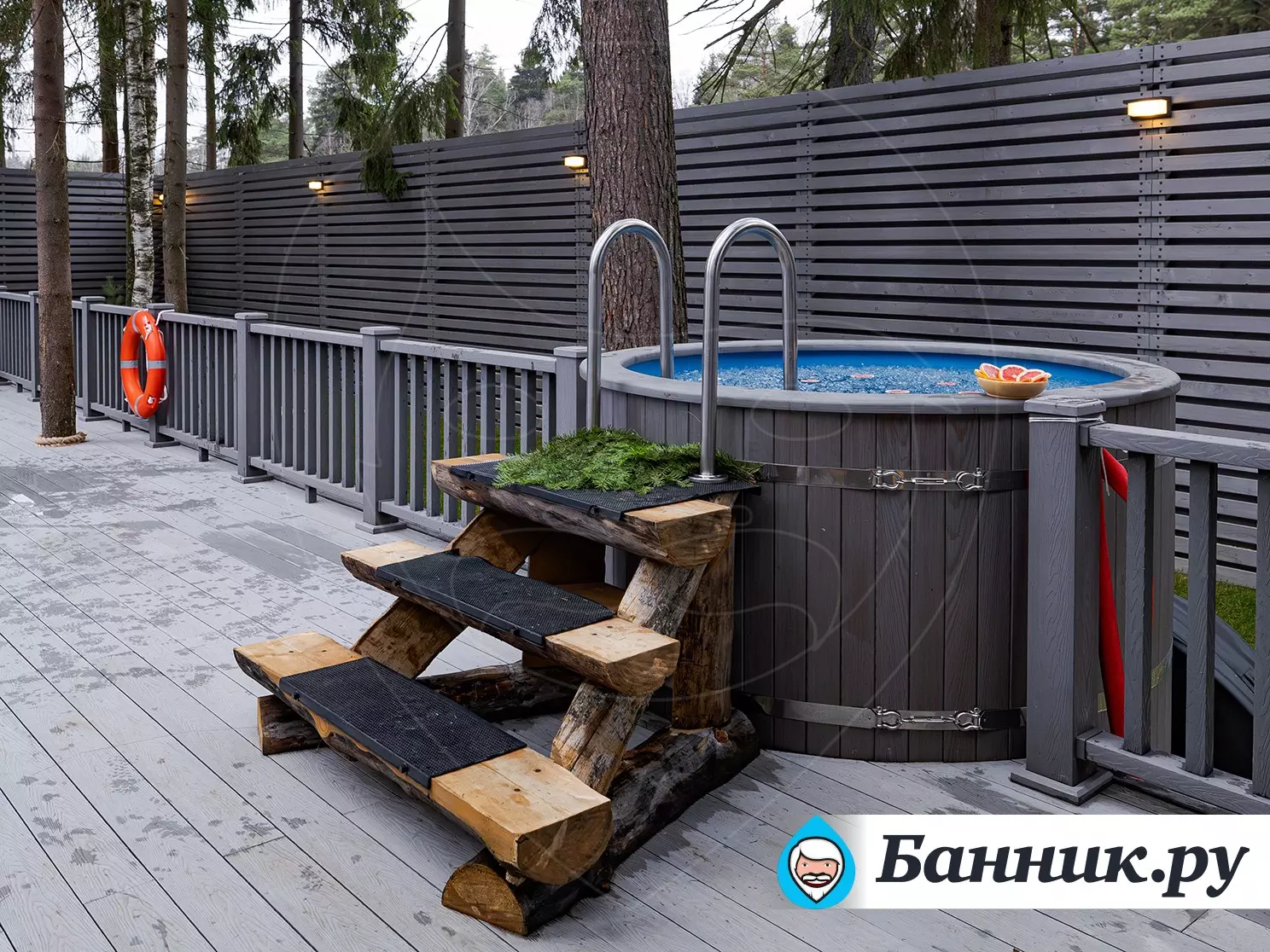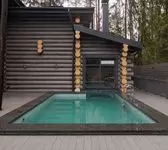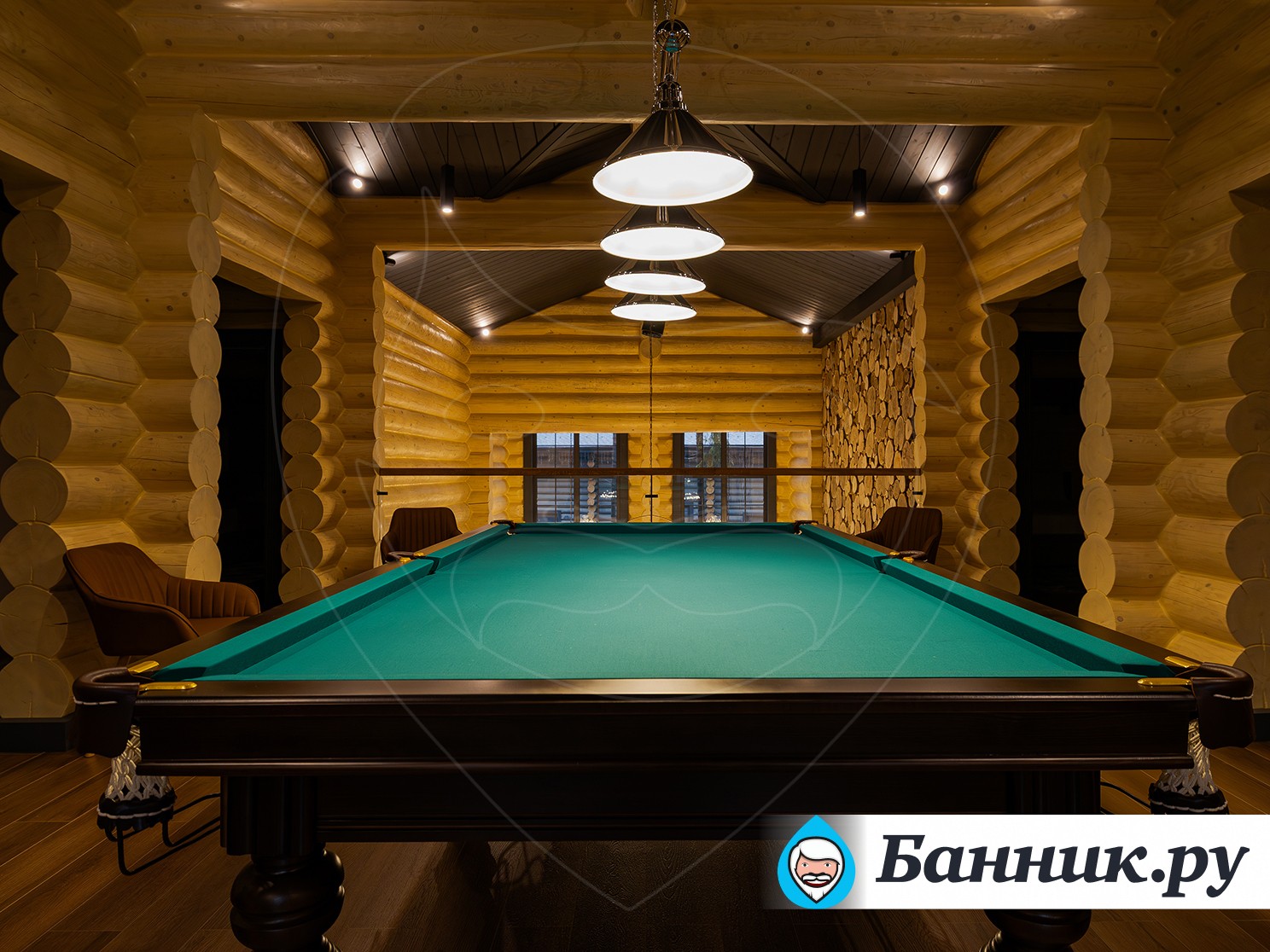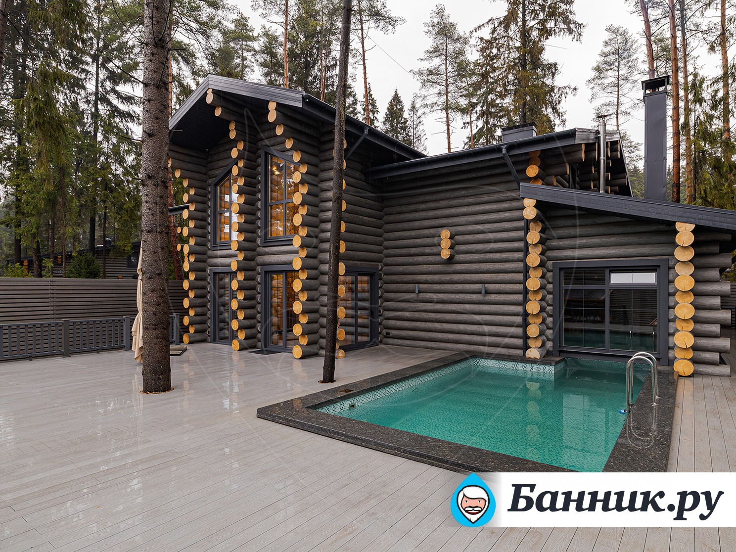 Баня выполнена из кело — уникальной северной древесины, которая отлично сохраняет тепло и создаёт атмосферу уюта. Среди банных удобств — соляная комната, чан, купель и уличный бассейн.