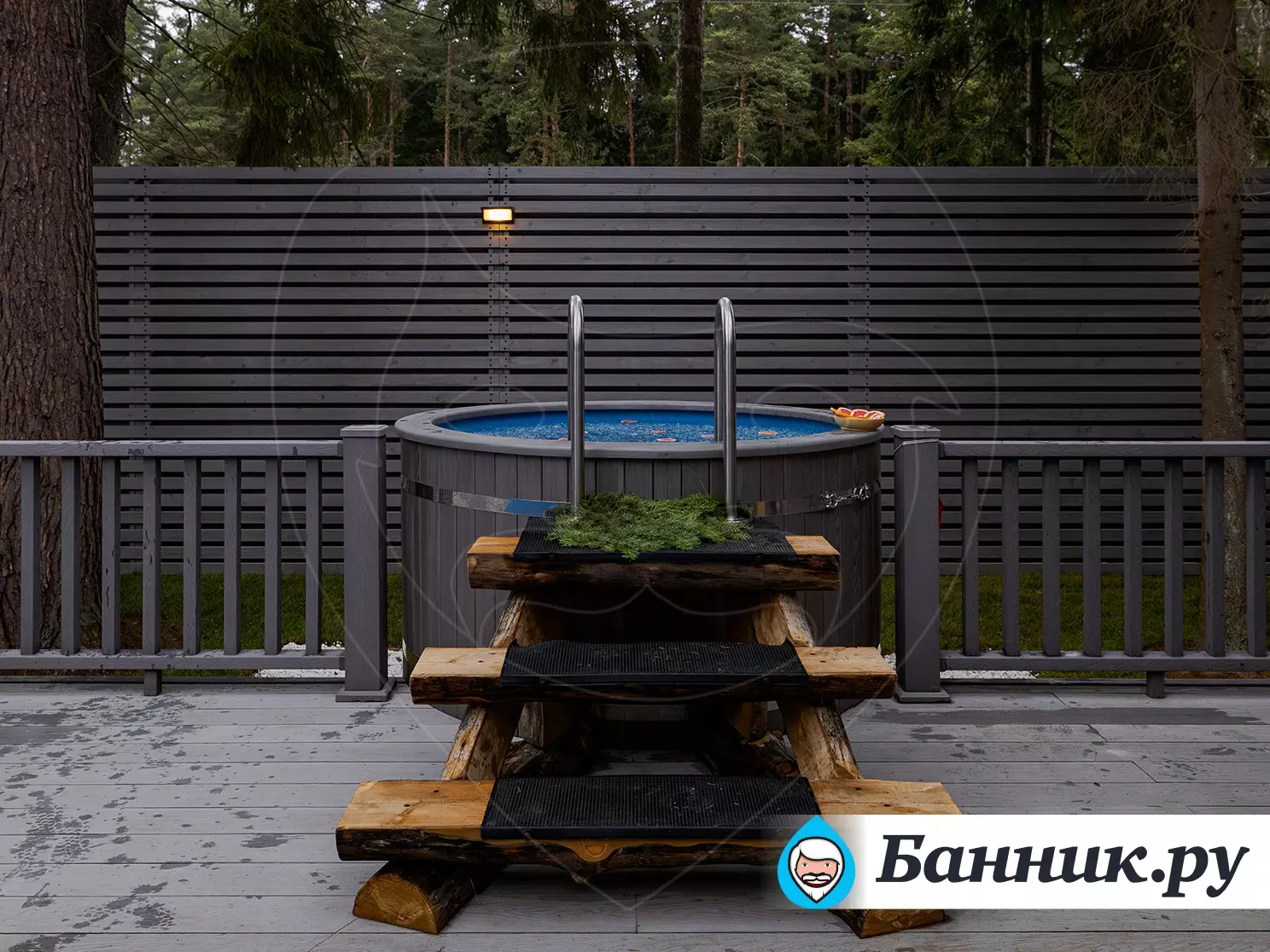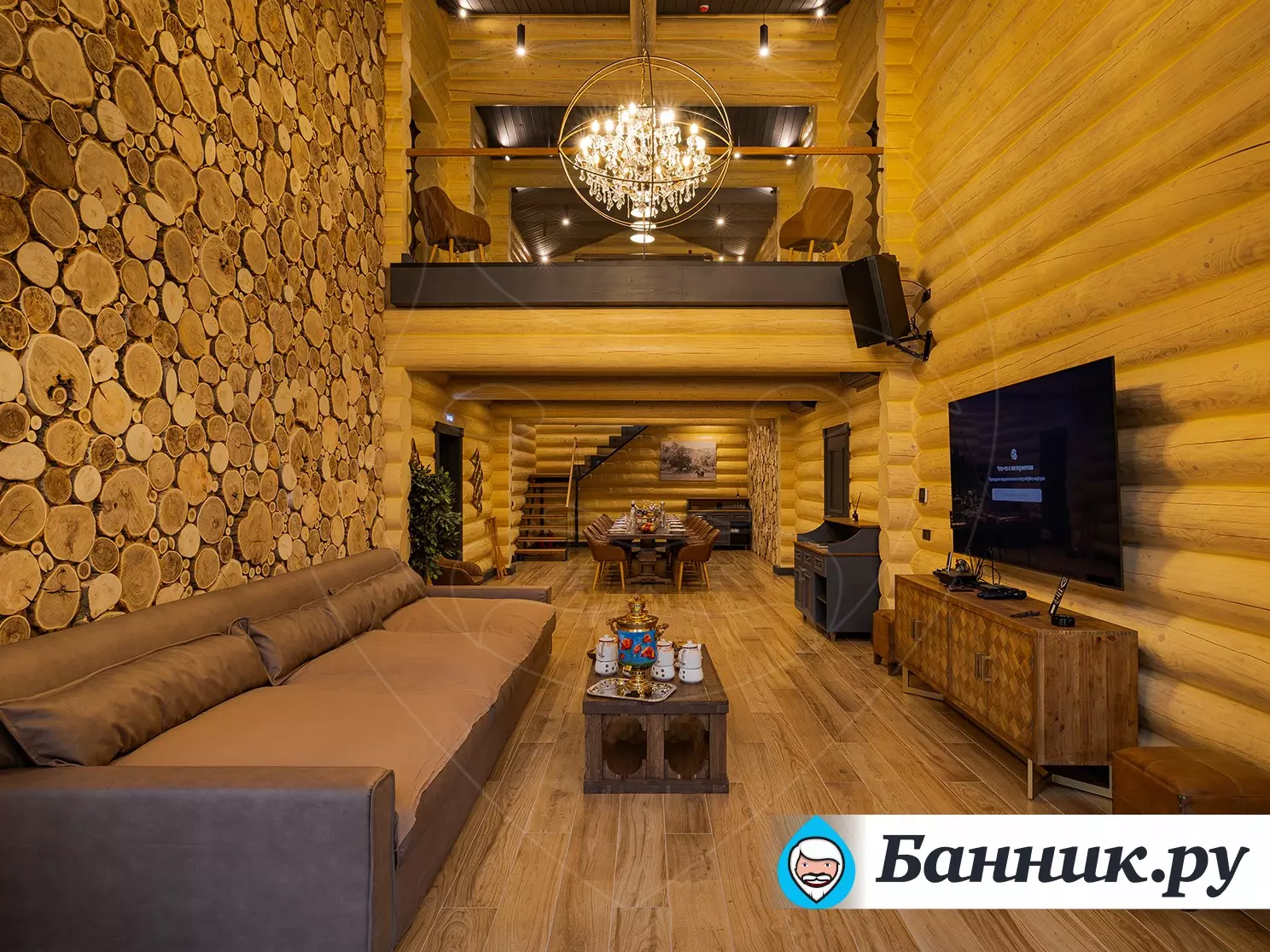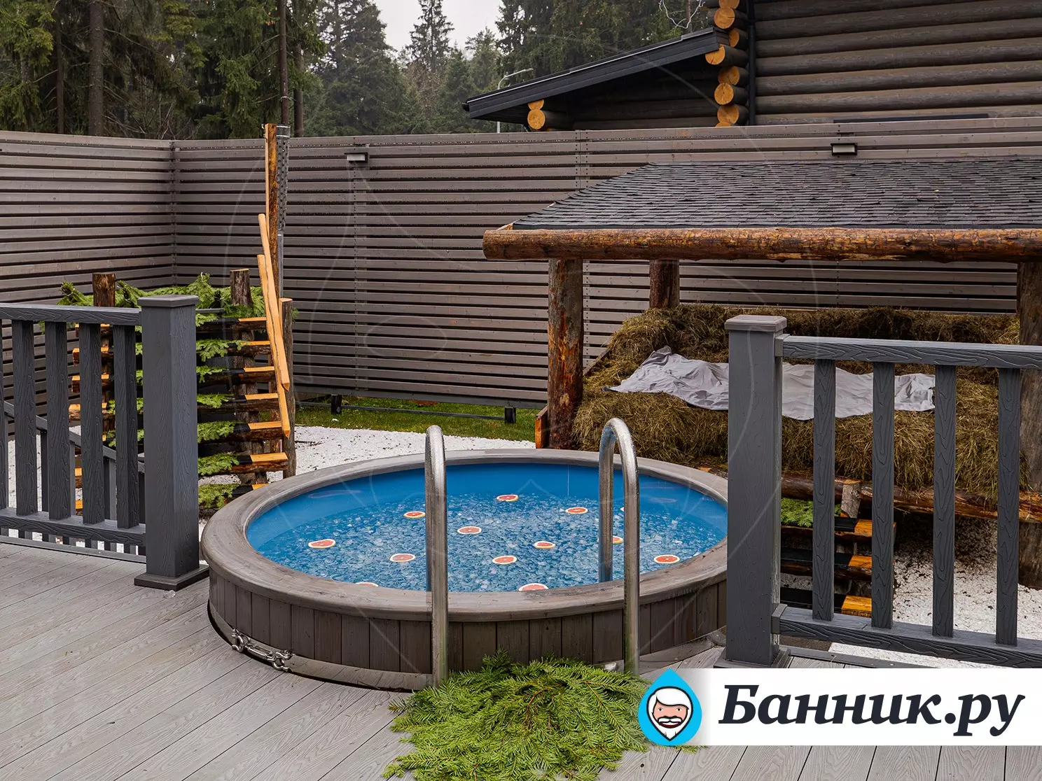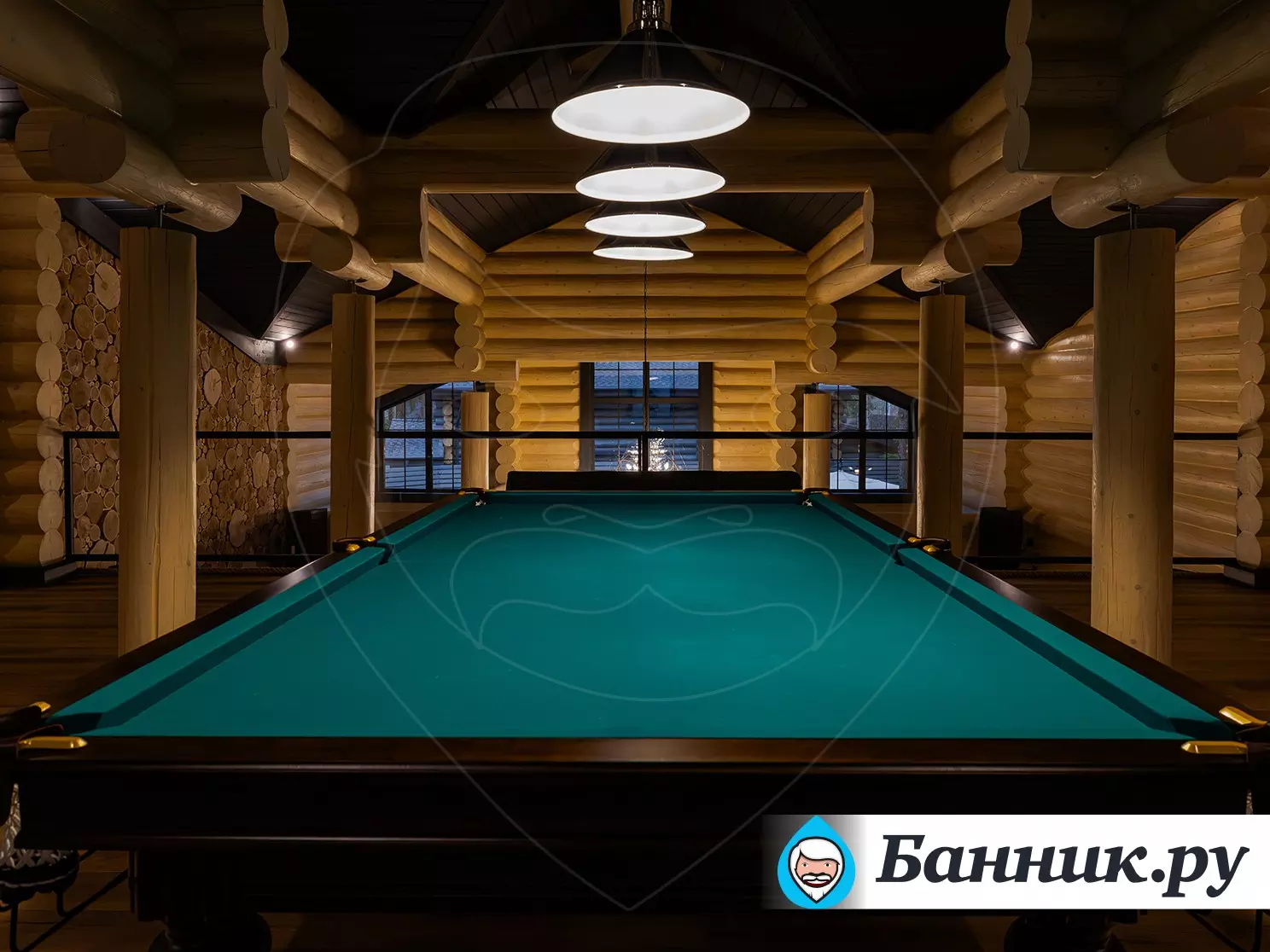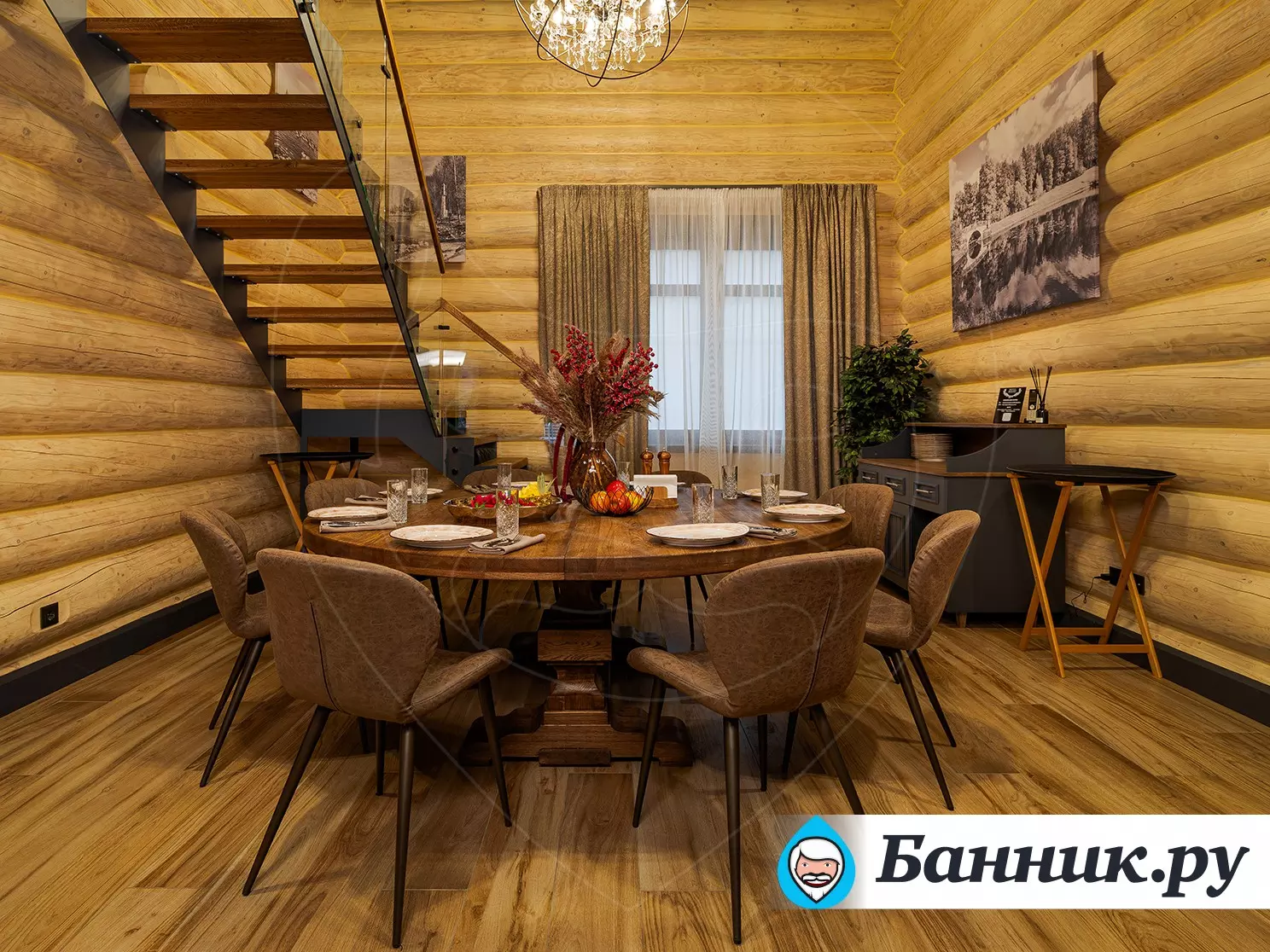 Баня выполнена из кело — уникальной северной древесины, которая отлично сохраняет тепло и создаёт атмосферу уюта. Среди банных удобств — соляная комната, чан, купель и уличный бассейн.