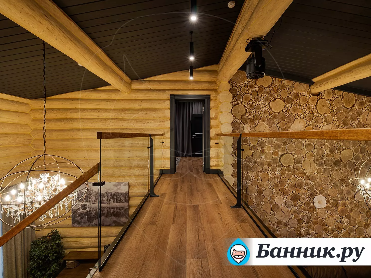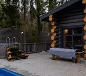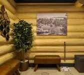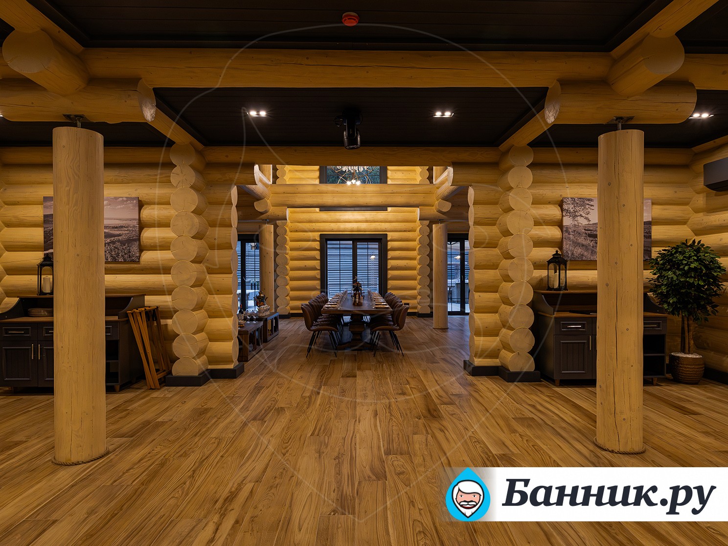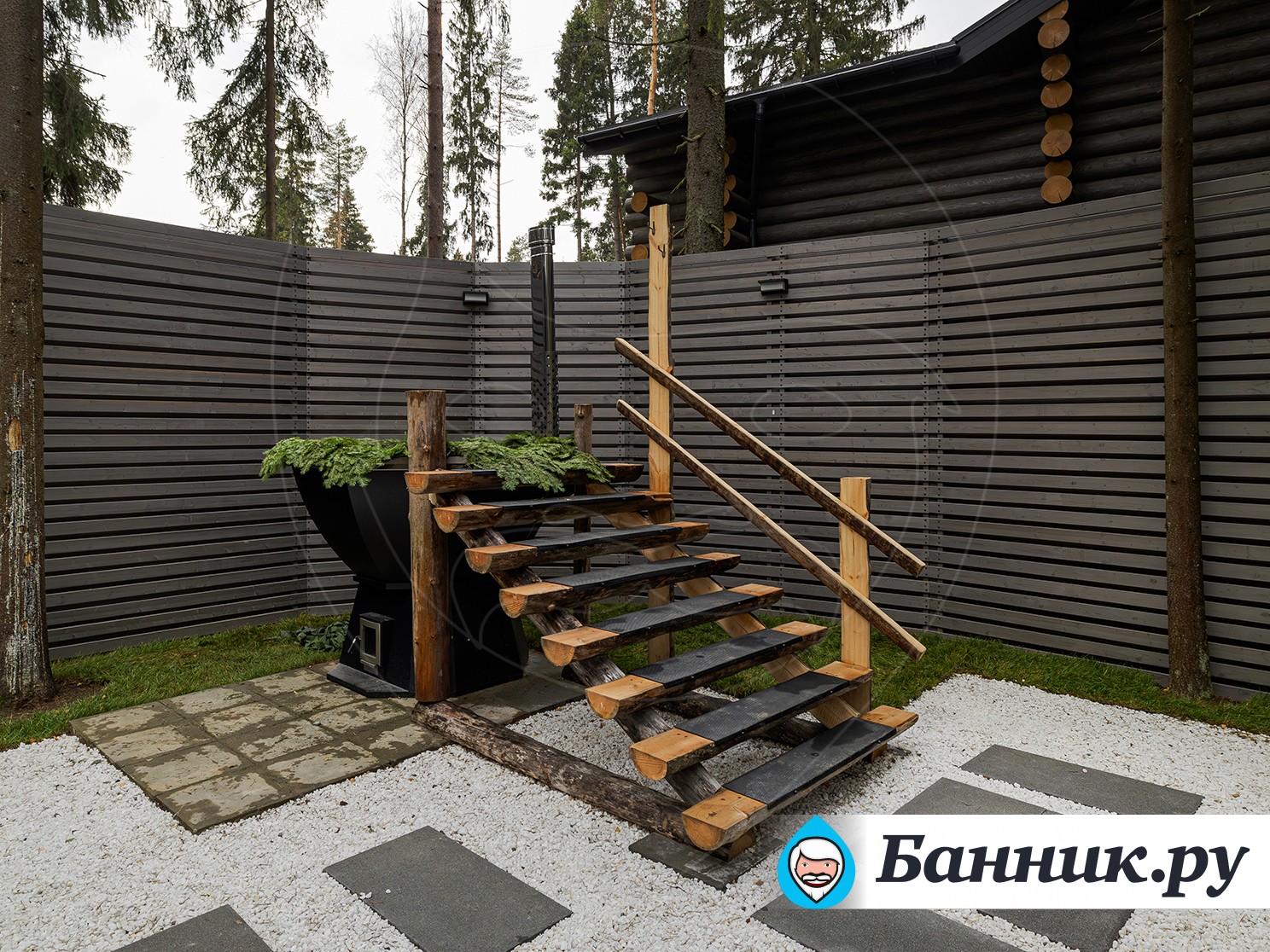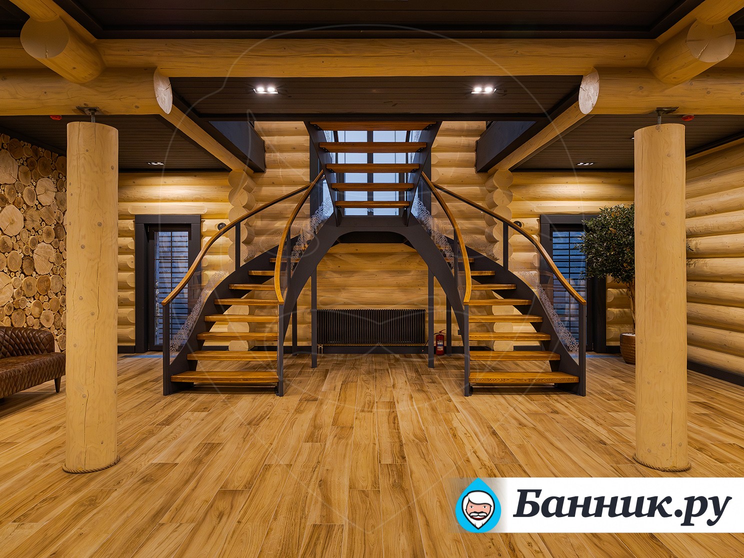 Баня выполнена из кело — уникальной северной древесины, которая отлично сохраняет тепло и создаёт атмосферу уюта. Среди банных удобств — соляная комната, чан, купель и уличный бассейн.