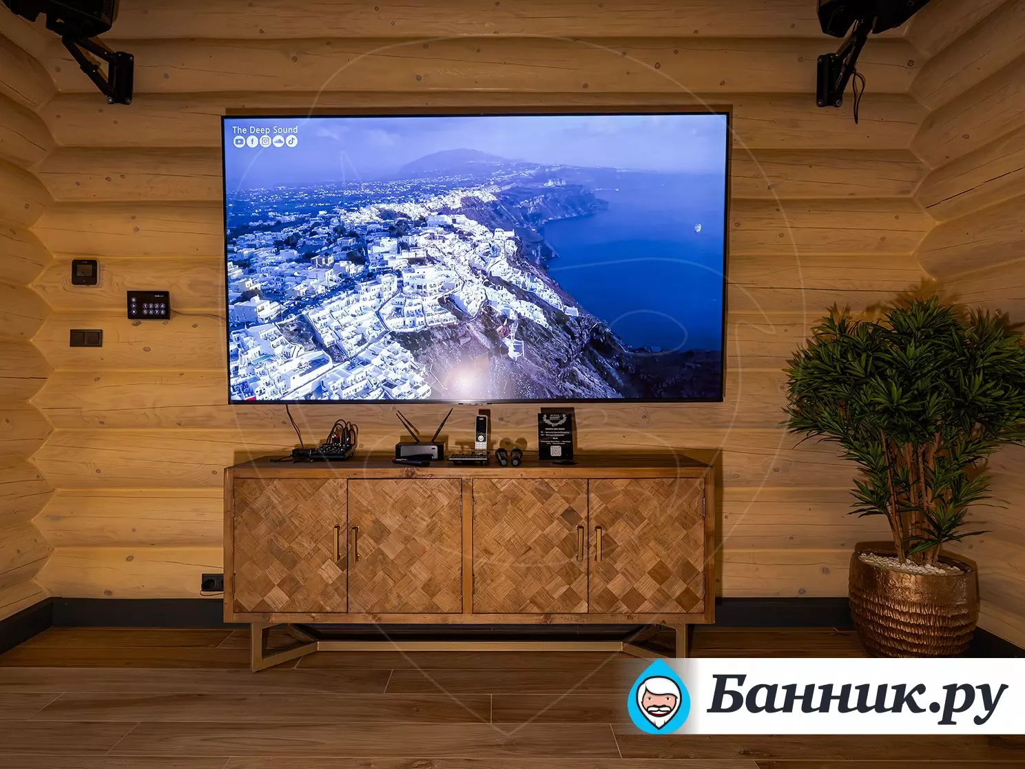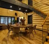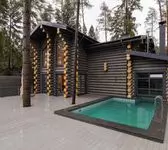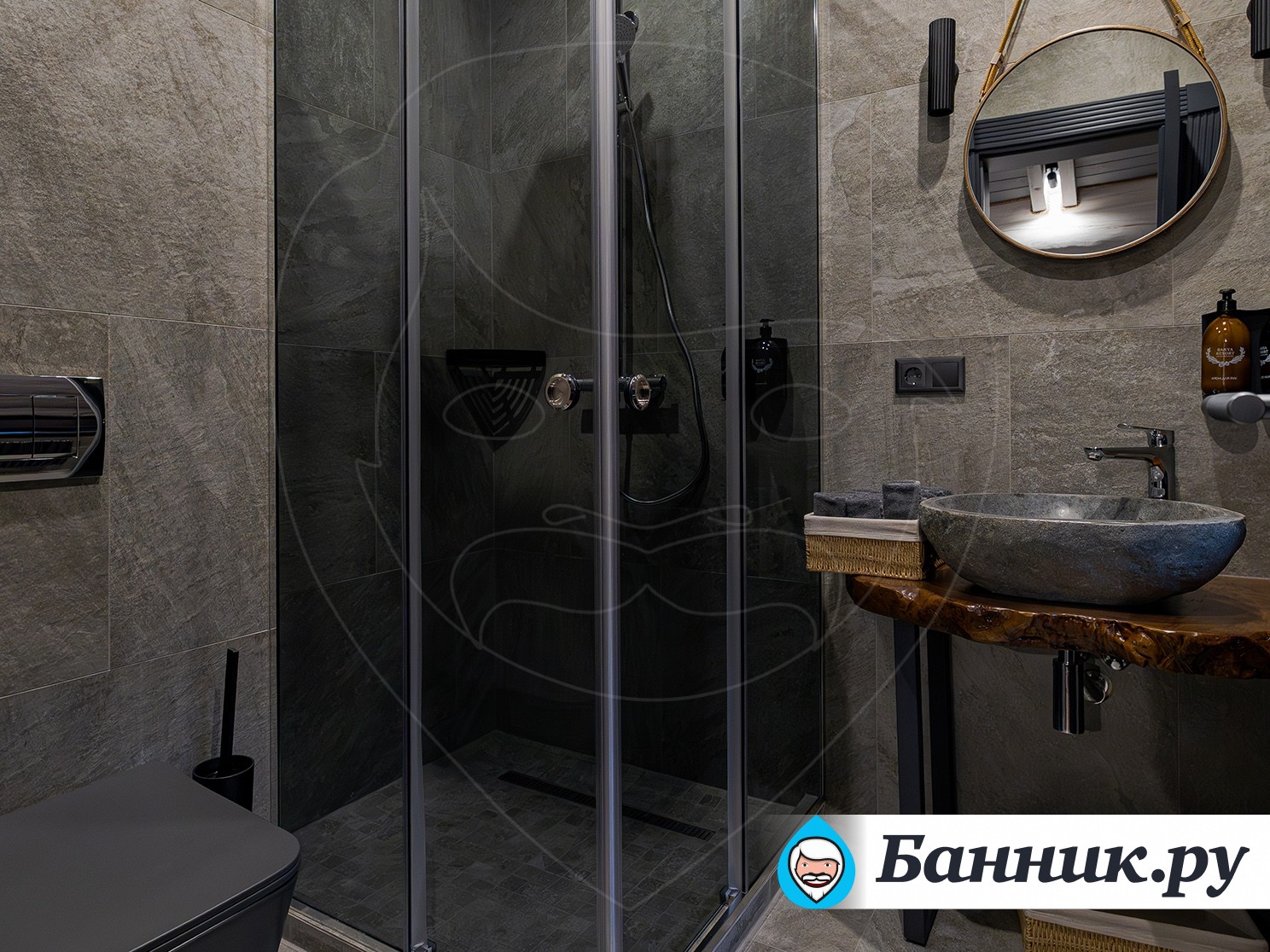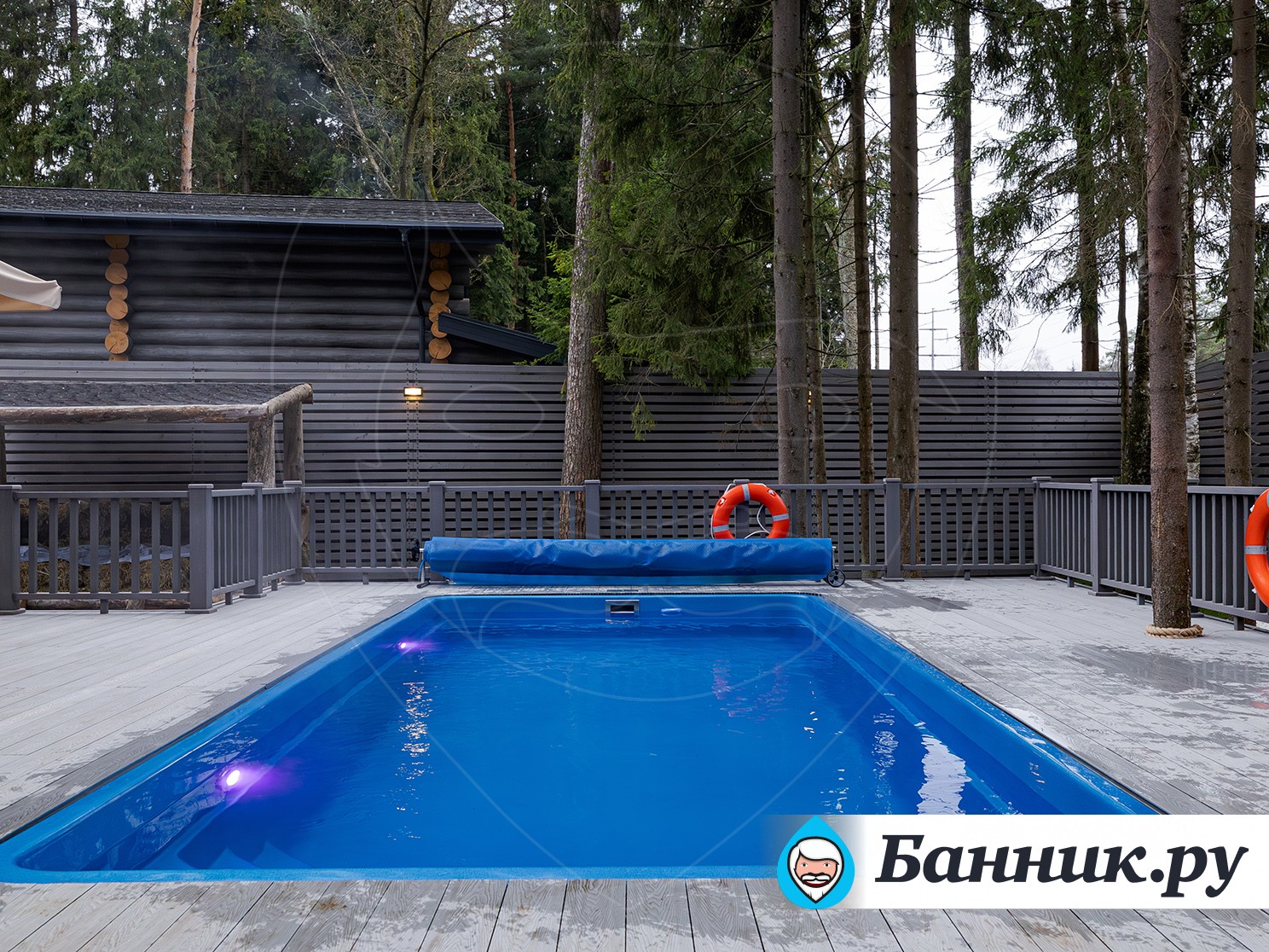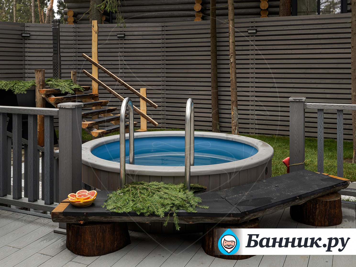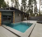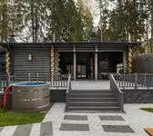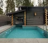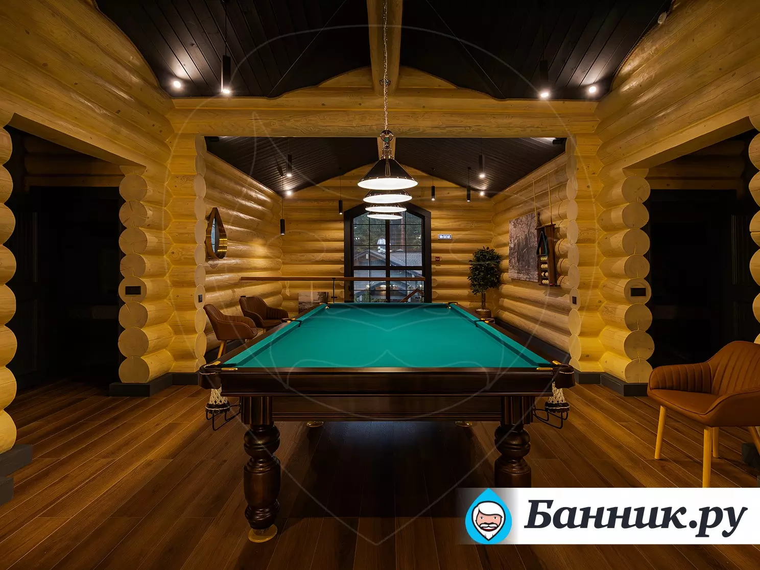 Баня выполнена из кело — уникальной северной древесины, которая отлично сохраняет тепло и создаёт атмосферу уюта. Среди банных удобств — соляная комната, чан, купель и уличный бассейн.