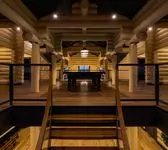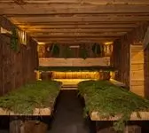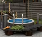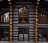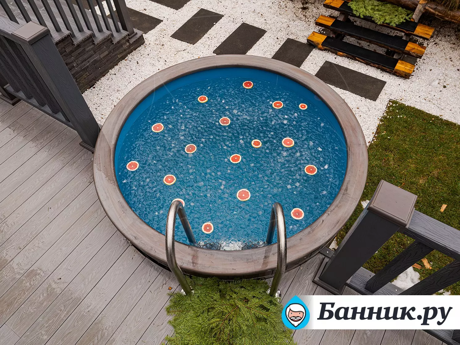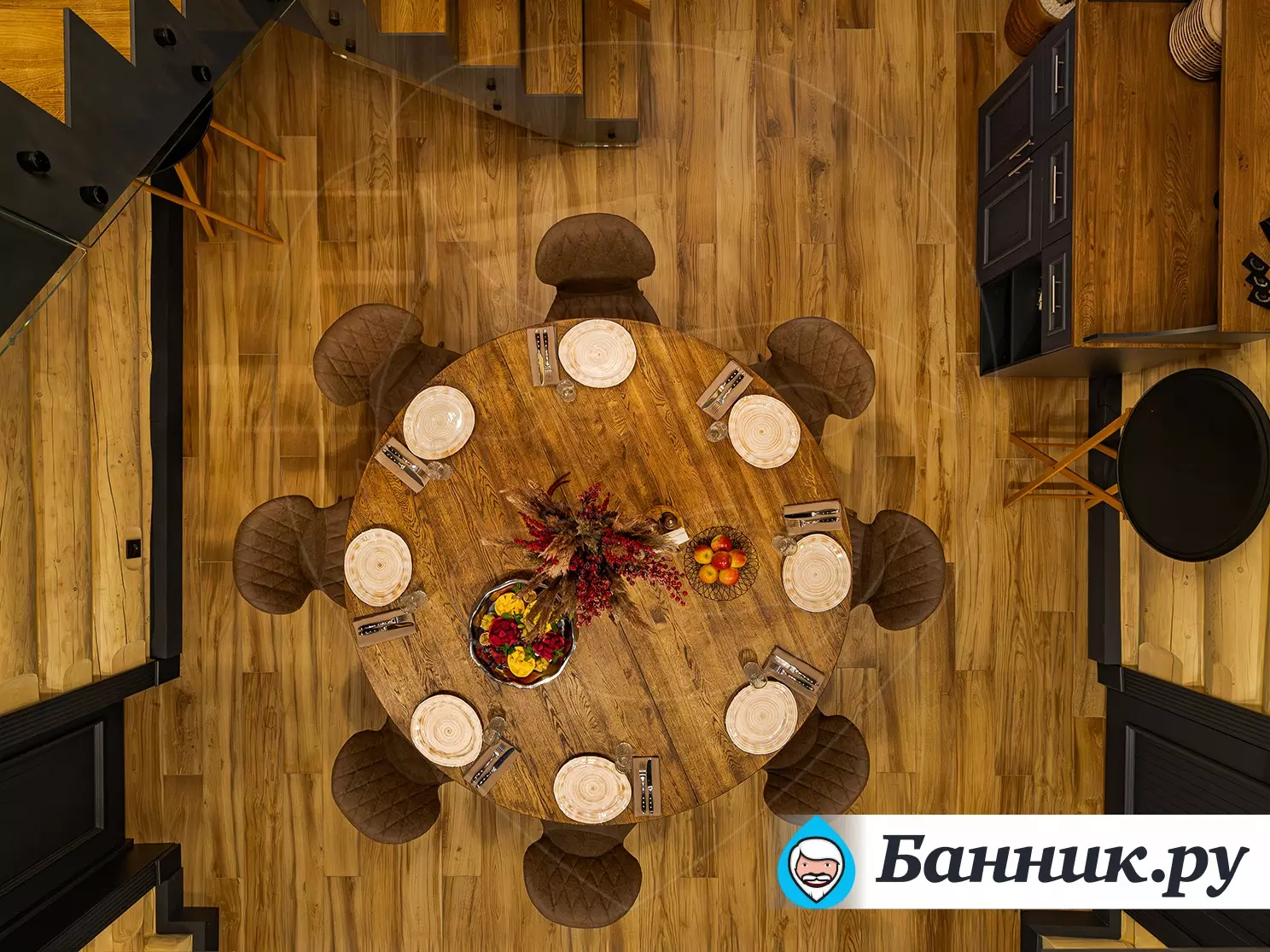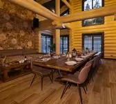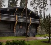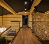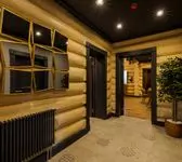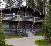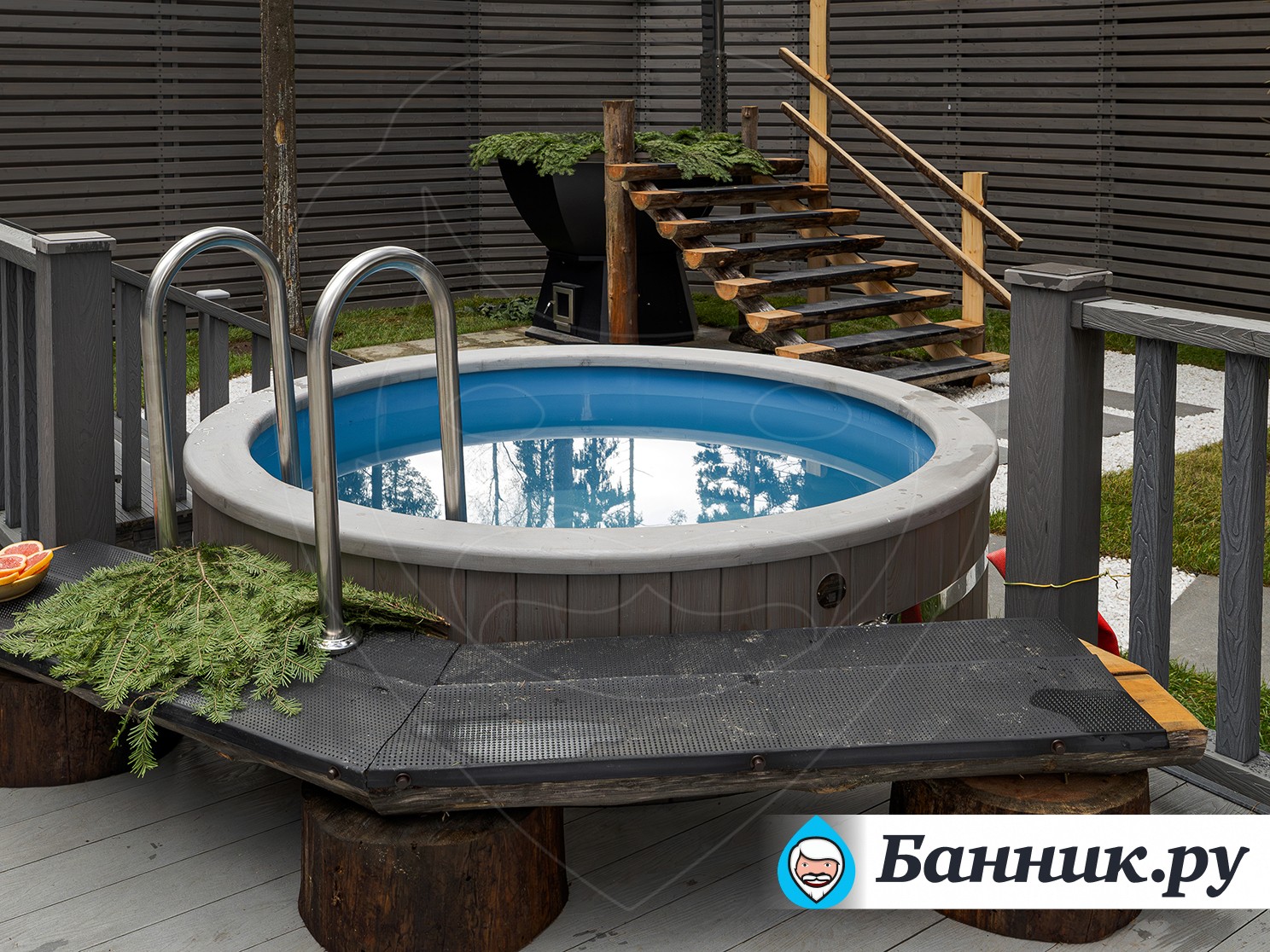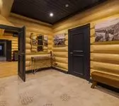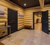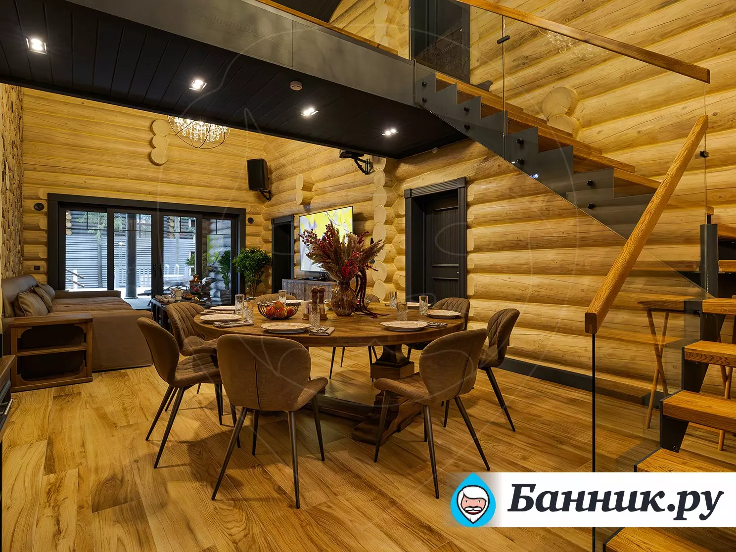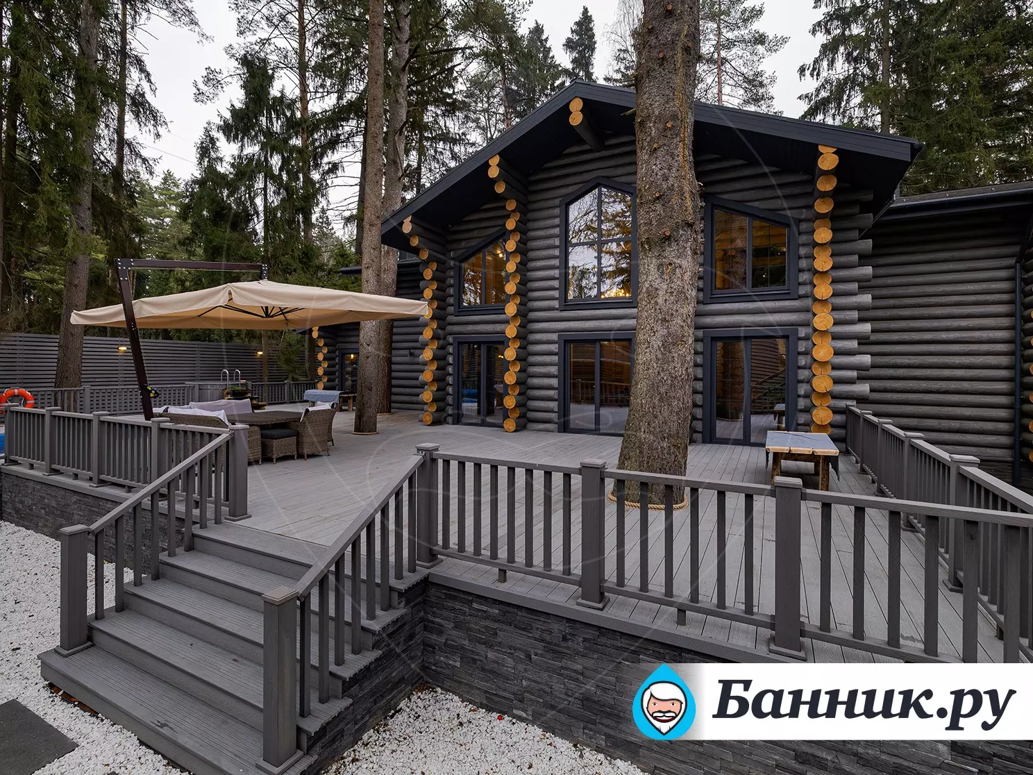 Баня выполнена из кело — уникальной северной древесины, которая отлично сохраняет тепло и создаёт атмосферу уюта. Среди банных удобств — соляная комната, чан, купель и уличный бассейн.