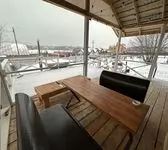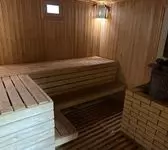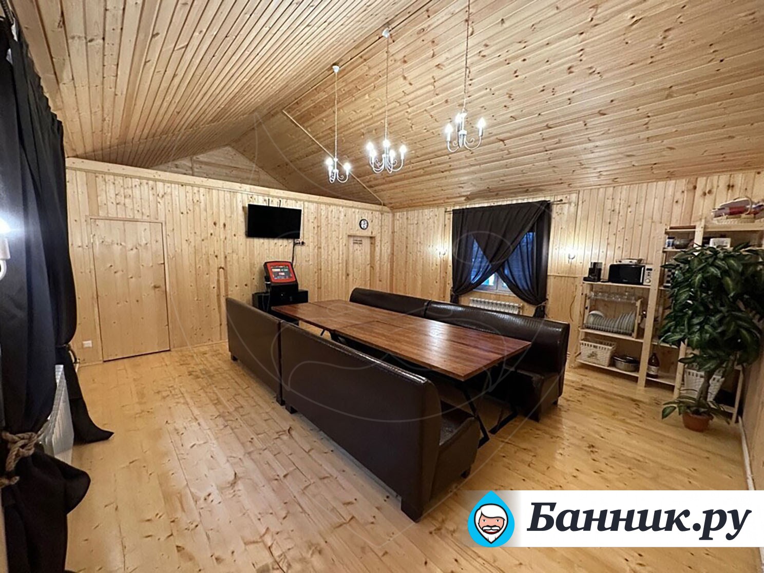 В зале расположены телевизор, большой стол, комфортные диваны. Имеются чайник и микроволновая печь, вся необходимая посуда, столовые приборы. Подключен гостевой Wi-fi. Гостям предлагаются развлечения в виде караоке и настольных игр. В теплое время года можно расположиться на веранде, где вы найдете мангал, казан, шампура, сетки. За отдельную плату предоставляются веники, сибирский чан, полотенца, накидки, халат, тапочки, шапочки, большой выбор чая.
