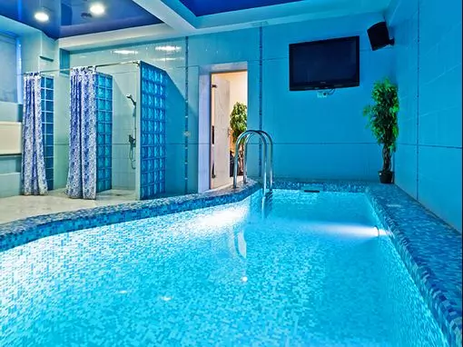 В четвертом зале вы можете искупаться в бассейне с водопадом и погреться в финской сауне. Здесь могут расположиться компании до 16 человек.