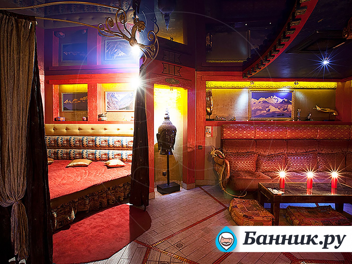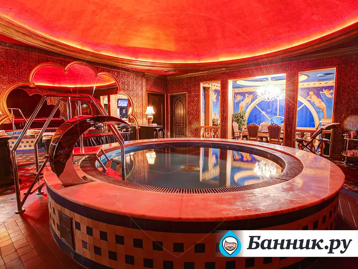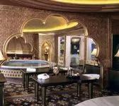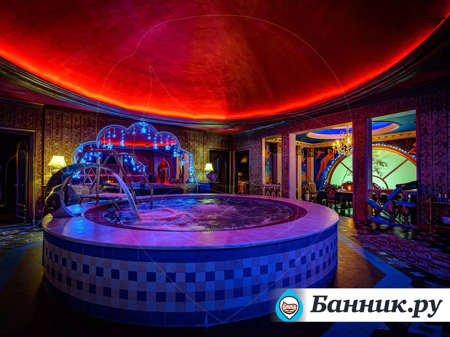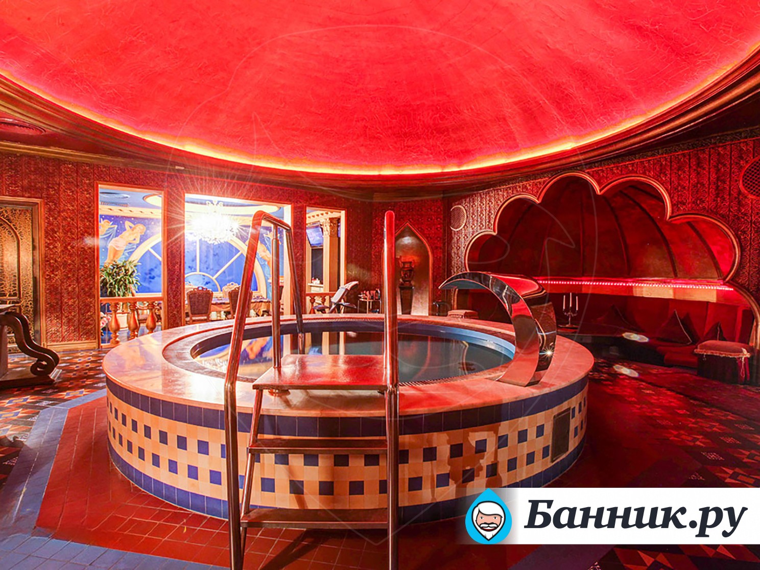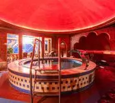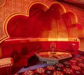 К вашим услугам большой круглый бассейн, выложенный традиционной сине-белой мозаикой, с водопадом. Двухуровневые апартаменты для отдыха, выполненные в разных стилях. Например: апартаменты Будда, апартаменты Тамерлан и Людовика XIV, кальянная комната и караоке система. В гостином зале очаровательные наложницы предложат своему султану блюда нашего ресторана и напитки из бара.