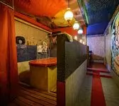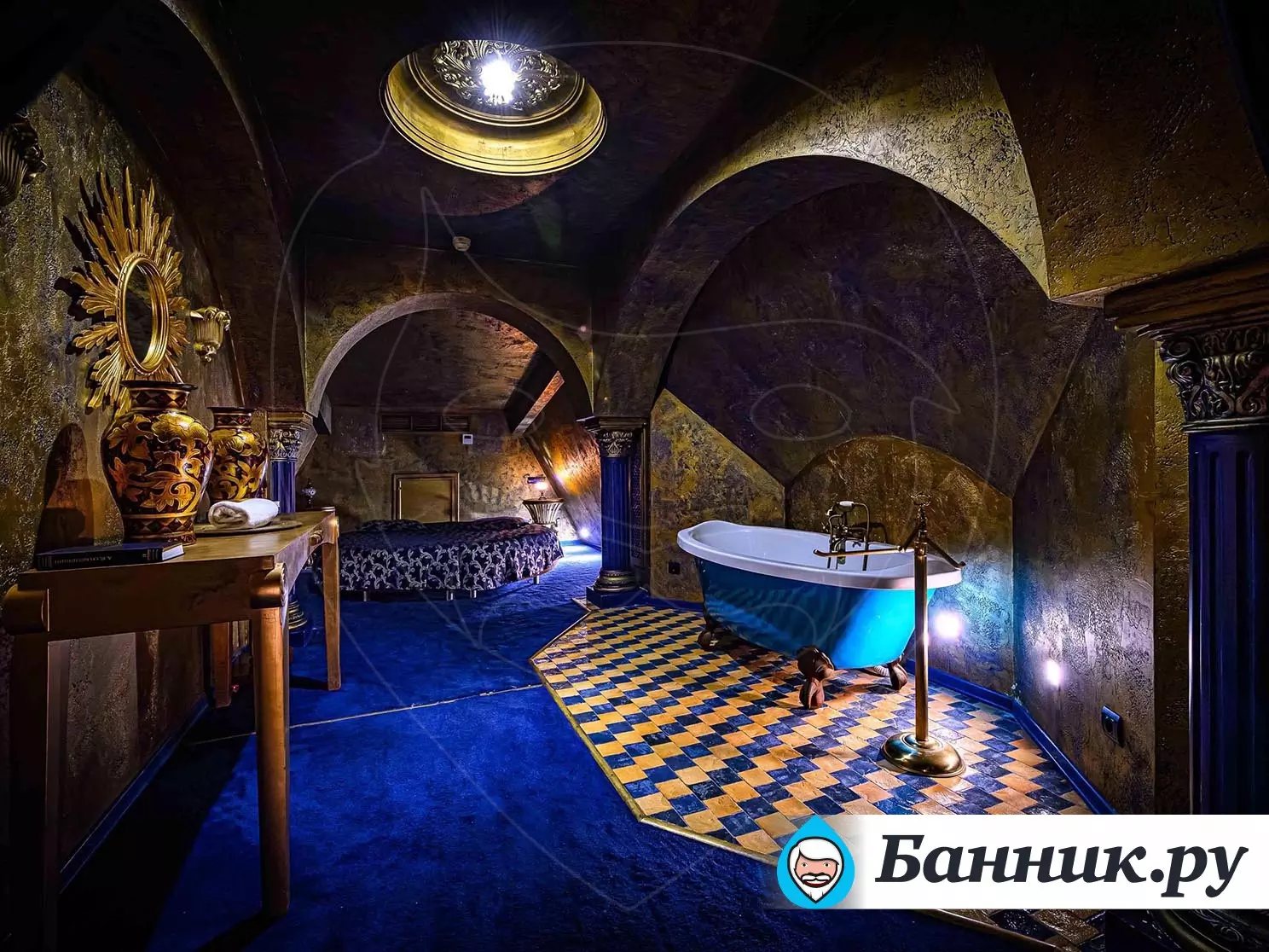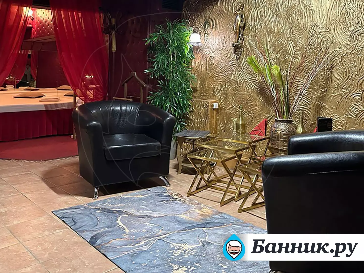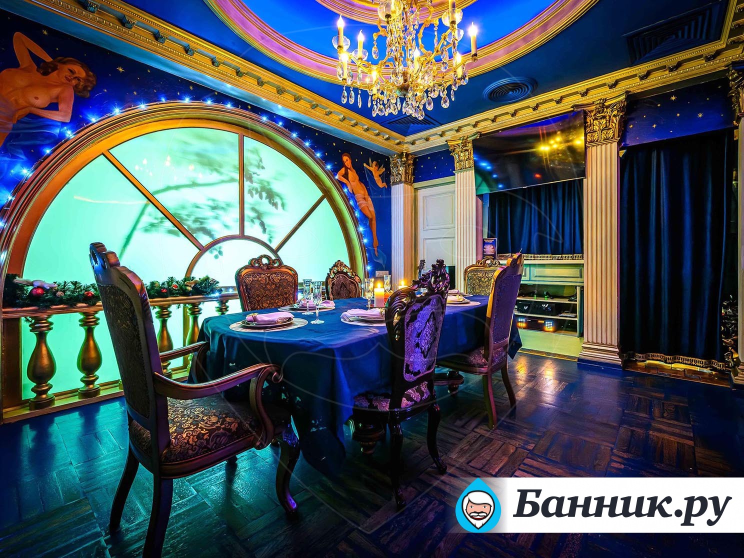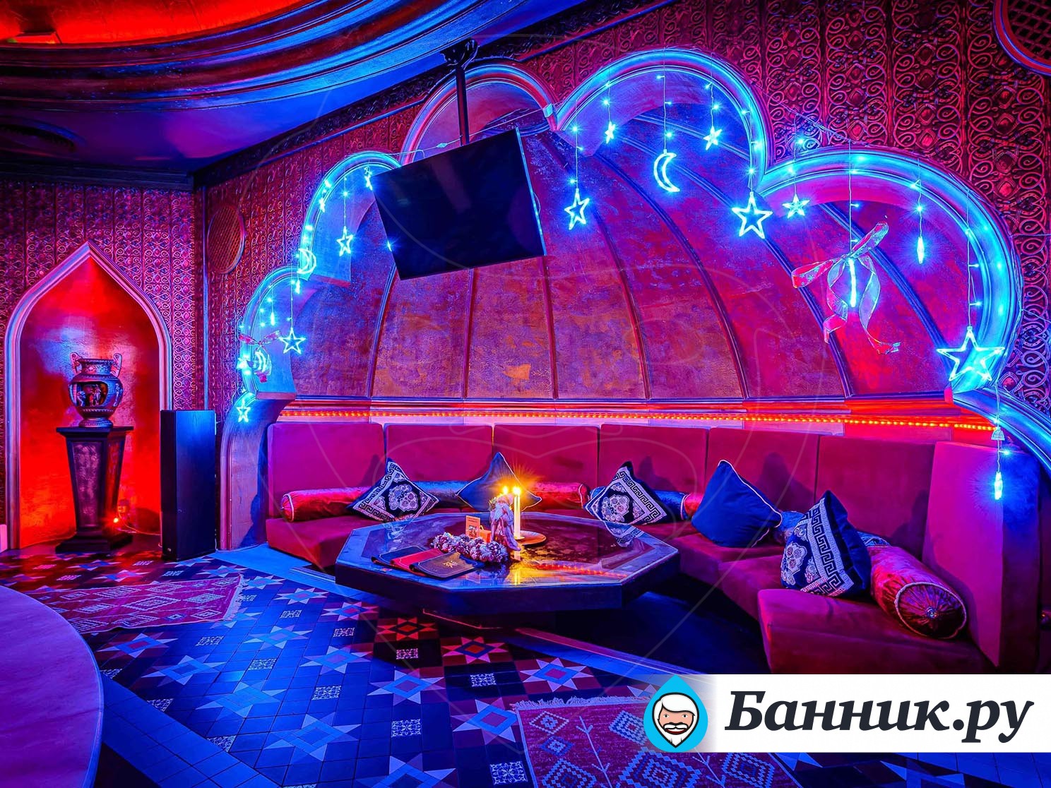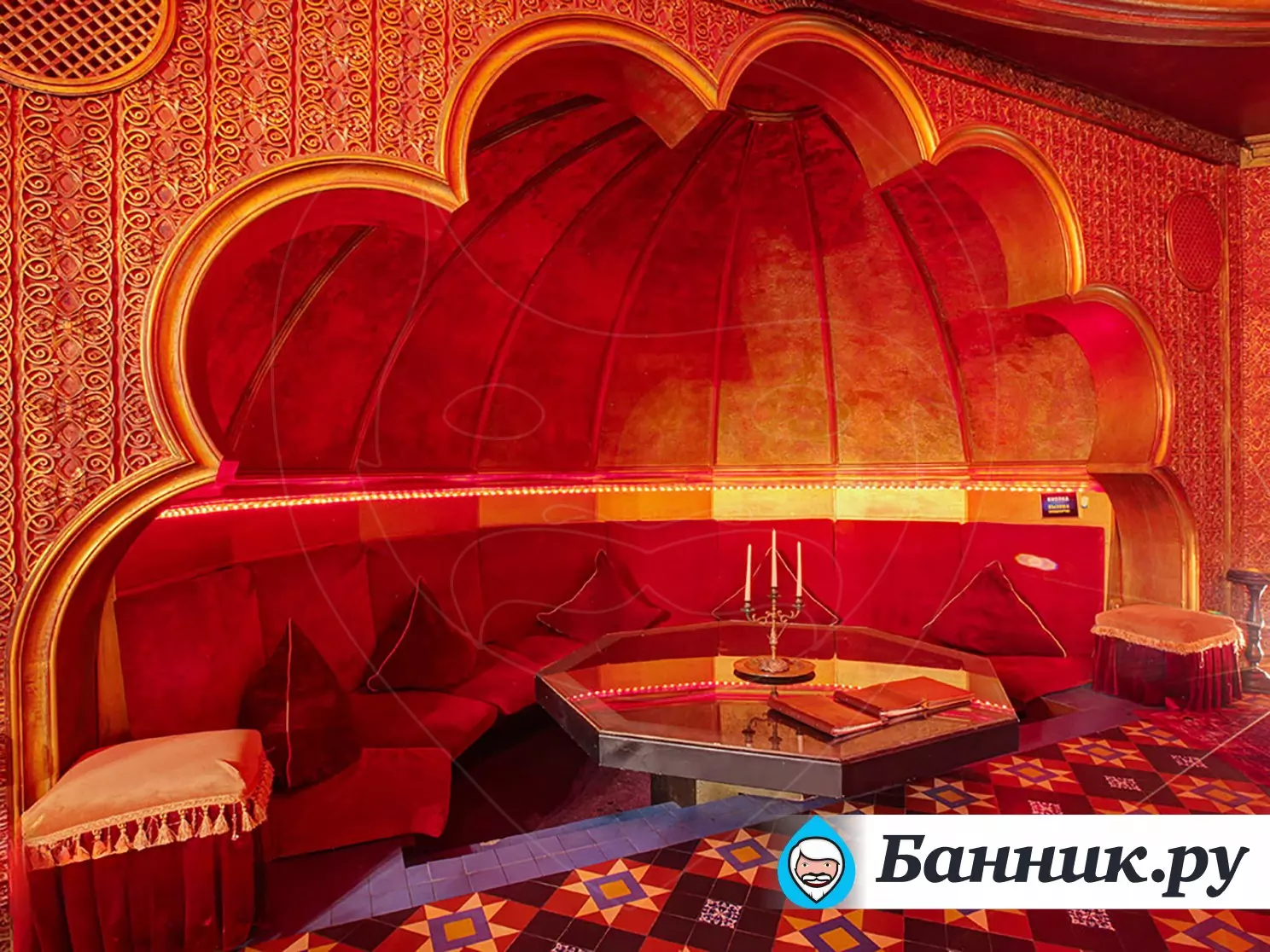 К вашим услугам большой круглый бассейн, выложенный традиционной сине-белой мозаикой, с водопадом. Двухуровневые апартаменты для отдыха, выполненные в разных стилях. Например: апартаменты Будда, апартаменты Тамерлан и Людовика XIV, кальянная комната и караоке система. В гостином зале очаровательные наложницы предложат своему султану блюда нашего ресторана и напитки из бара.