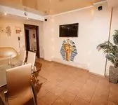 Номер оформлен в песочно-терракотовых тонах с дизайнерскими элементами египетской культуры. Просторная гостиная подходит для комфортабельного отдыха небольших компаний до 8 человек. Здесь установлен большой стол, просторный кожаный диван, телевизор и аудиосистема. Отдельная комната с бильярдом дополнит прекрасное времяпрепровождение в банном комплексе.