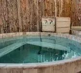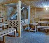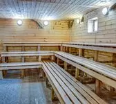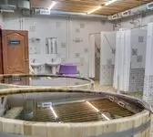 Комплекс включает в себя общее отделение с просторной парной, а также отдельные кабинеты для компаний на 4, 6 и 8 человек. Интерьеры выдержаны в деревенском стиле, создавая уютную и атмосферную обстановку. Мягкие сидения из натуральной кожи в зале для отдыха после парения не только дарят комфорт, но и служат персональными гардеробными шкафчиками для каждого гостя.