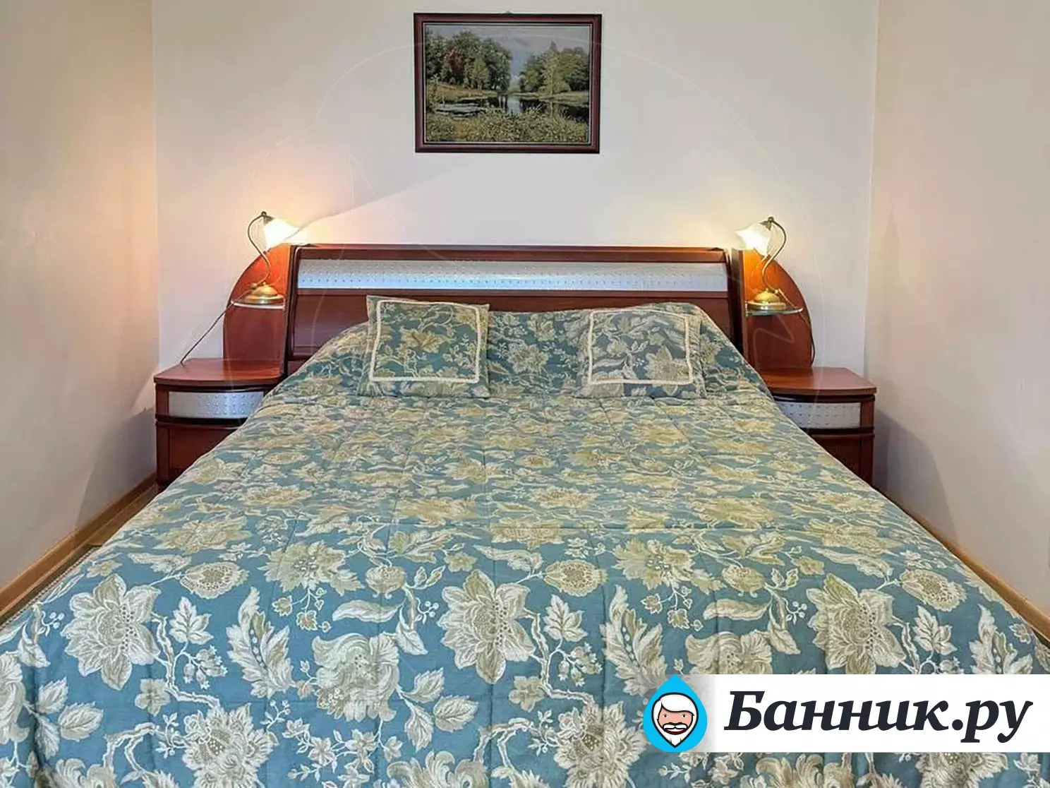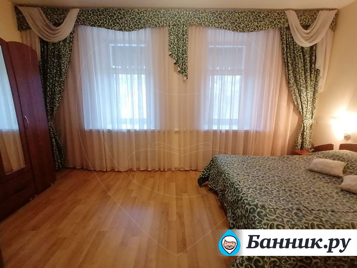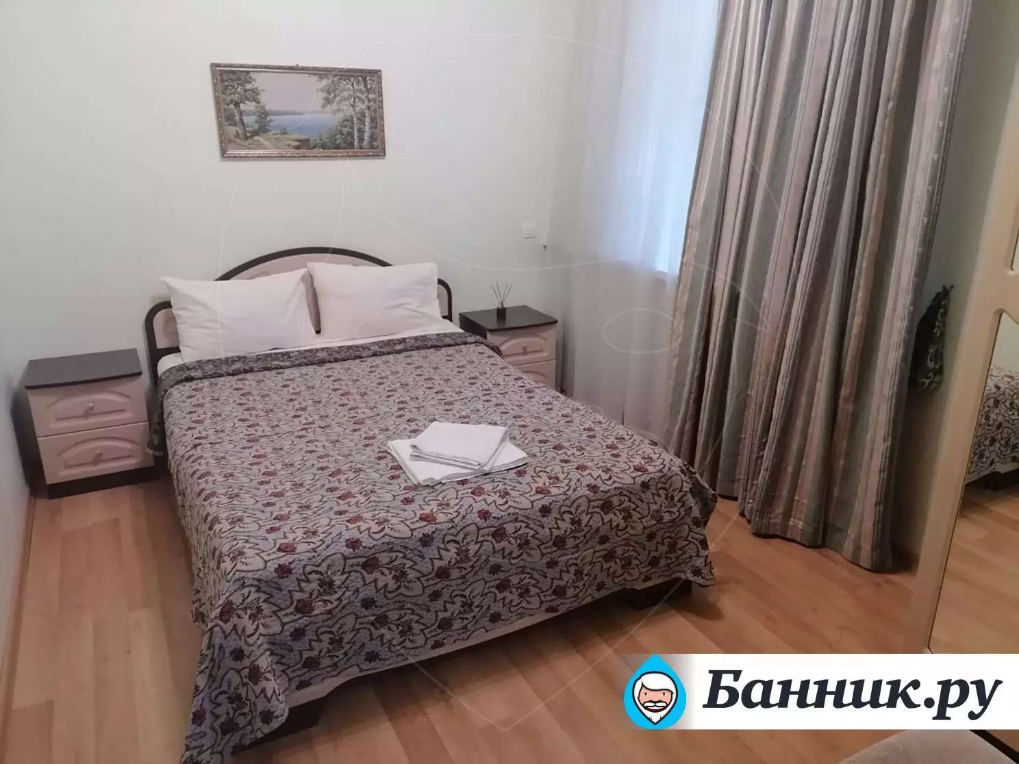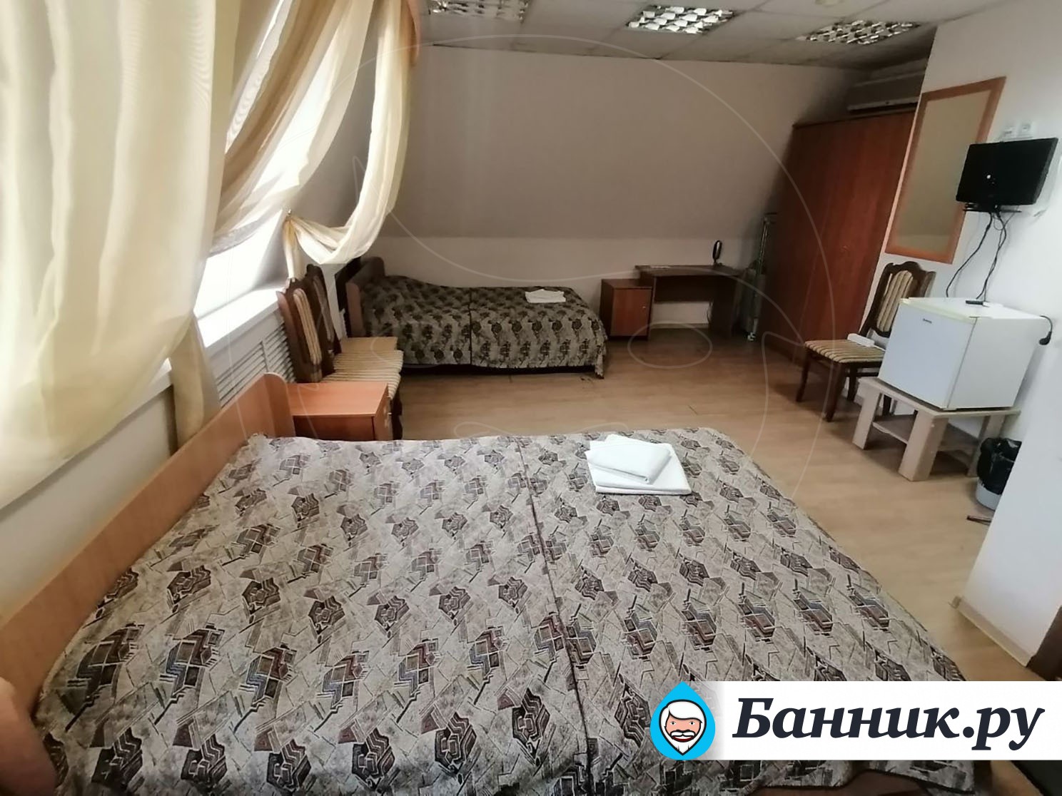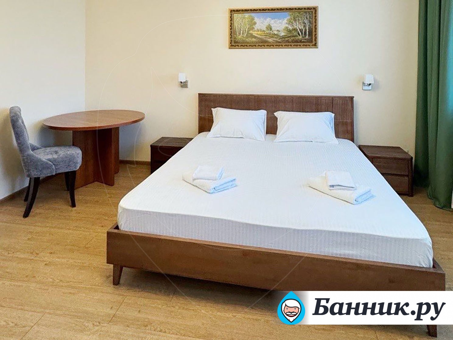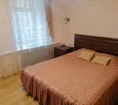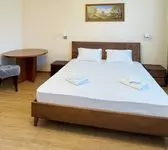 Уютный двухместный номер. Площадь номера — 46кв.м. В спальной зоне одна большая кровать (170 х 200), прикроватные тумбы, шкаф для одежды, телевизор, телефон, кондиционер. В гостиной — раскладной диван, журнальный столик, телевизор, чайник, набор необходимой посуды. В прихожей платяной шкаф, холодильник.