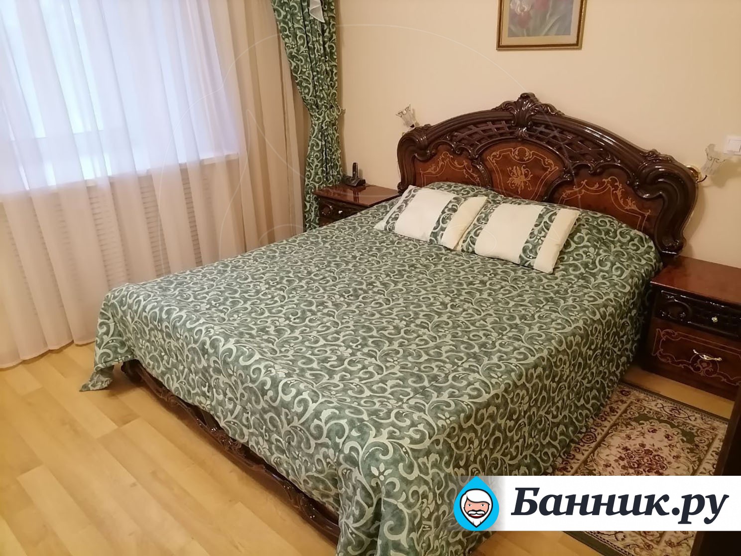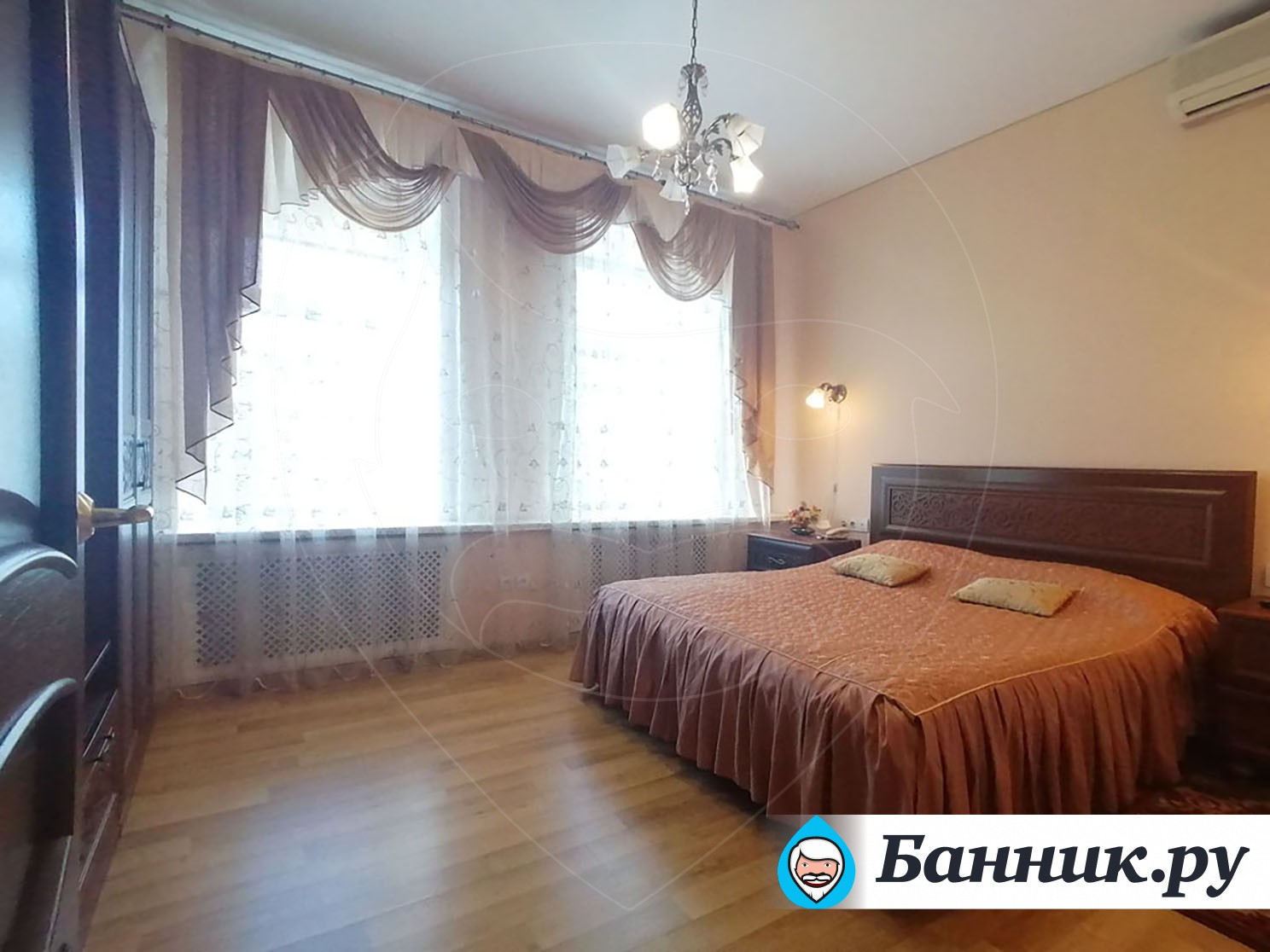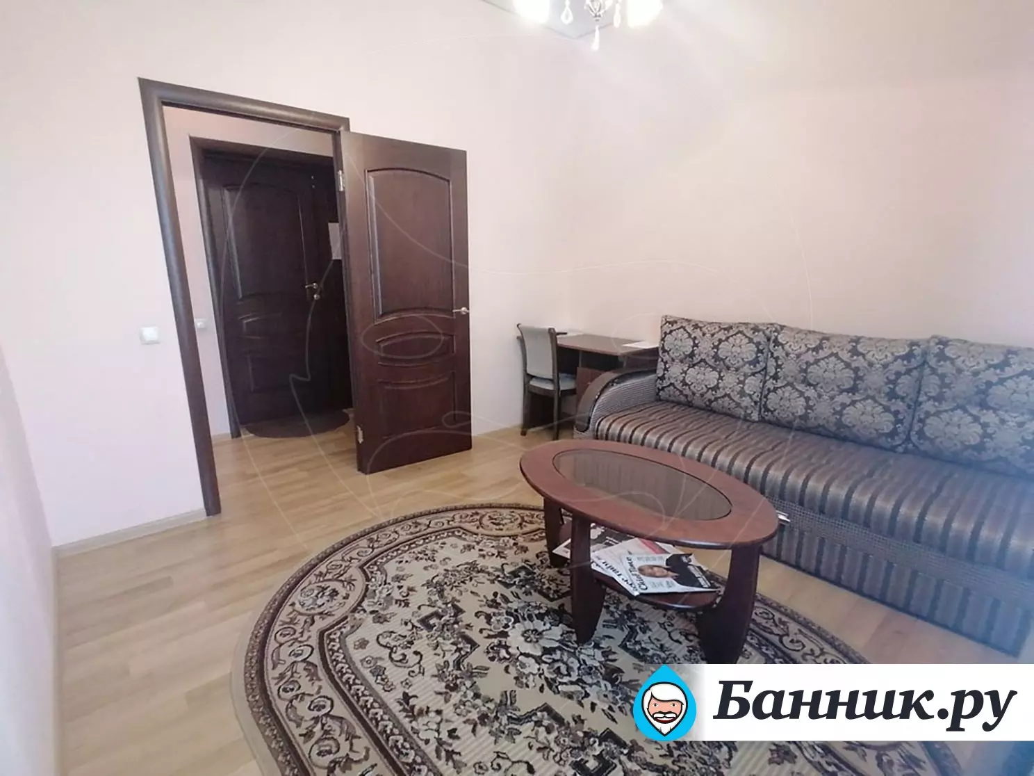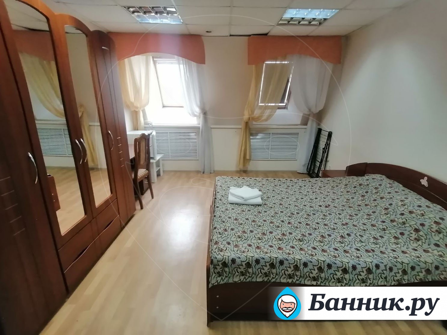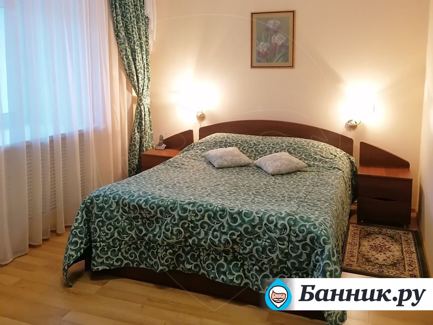 Уютный двухместный номер. Площадь номера — 46кв.м. В спальной зоне одна большая кровать (170 х 200), прикроватные тумбы, шкаф для одежды, телевизор, телефон, кондиционер. В гостиной — раскладной диван, журнальный столик, телевизор, чайник, набор необходимой посуды. В прихожей платяной шкаф, холодильник.