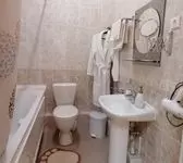 В ванной комнате: ванна, туалет, фен, бесплатные гигиенические принадлежности: мыло, шампунь, гель для душа, комплект полотенец, махровый халат, одноразовые тапочки. Все номера оборудованы кондиционерами.