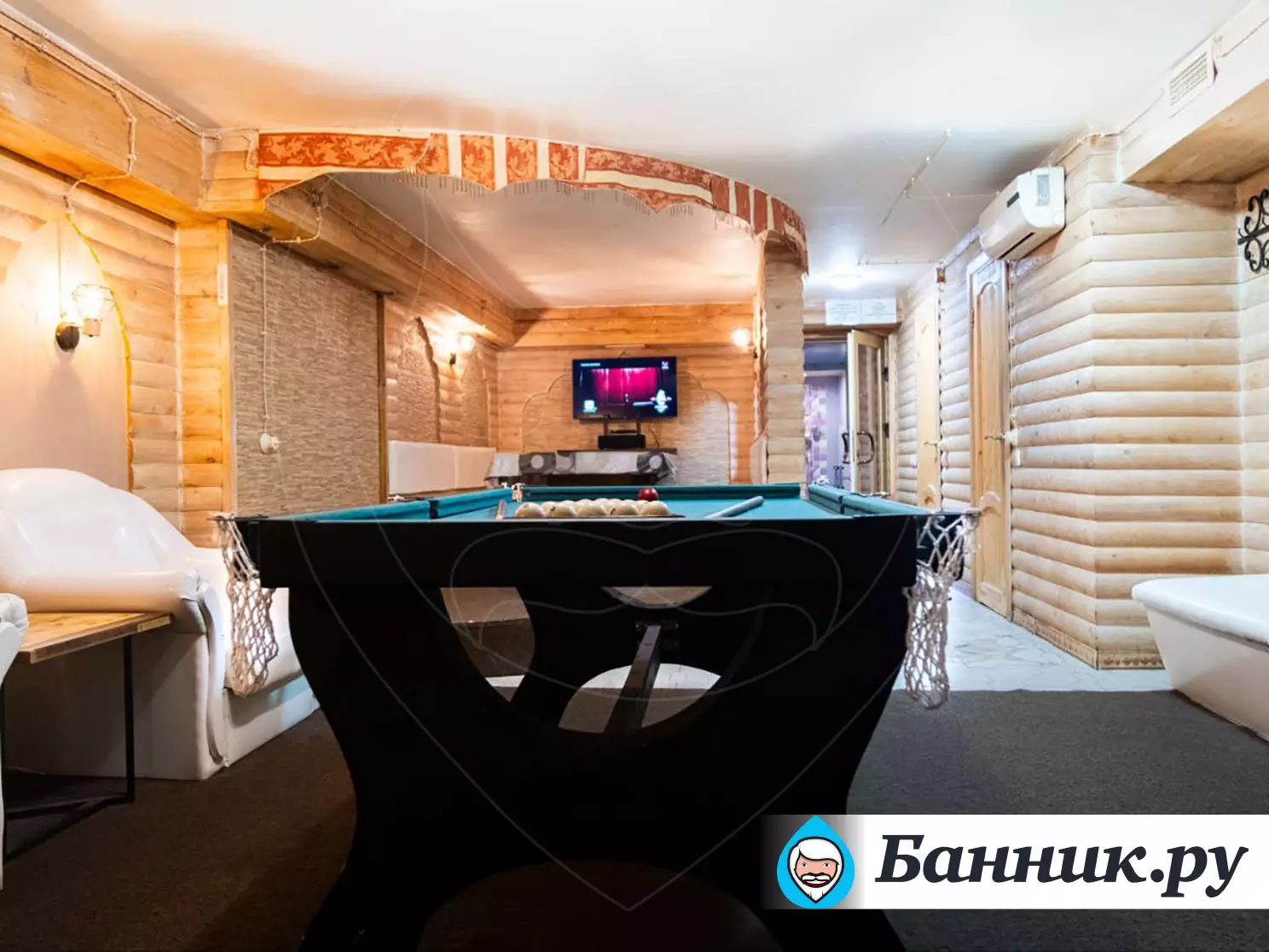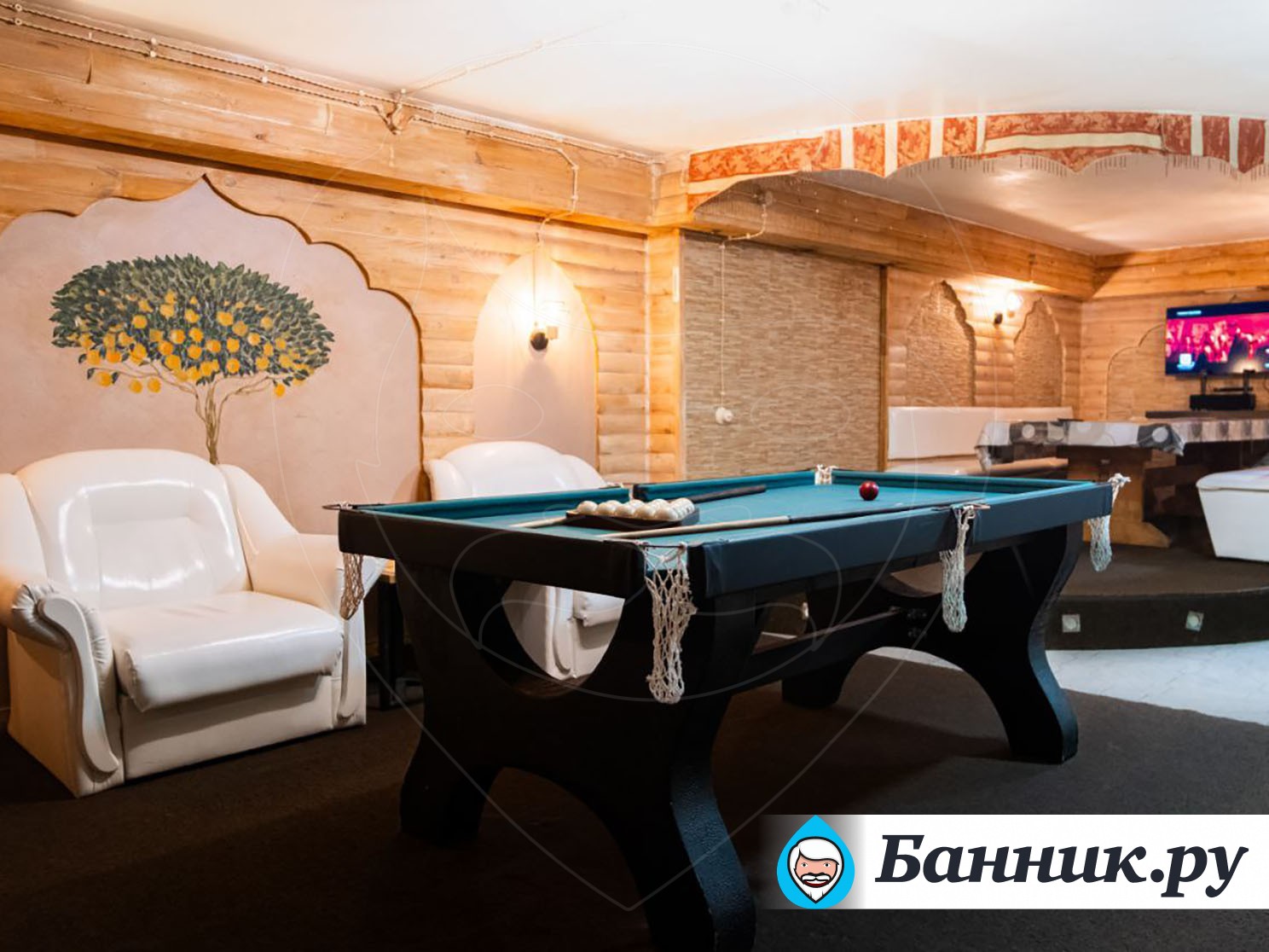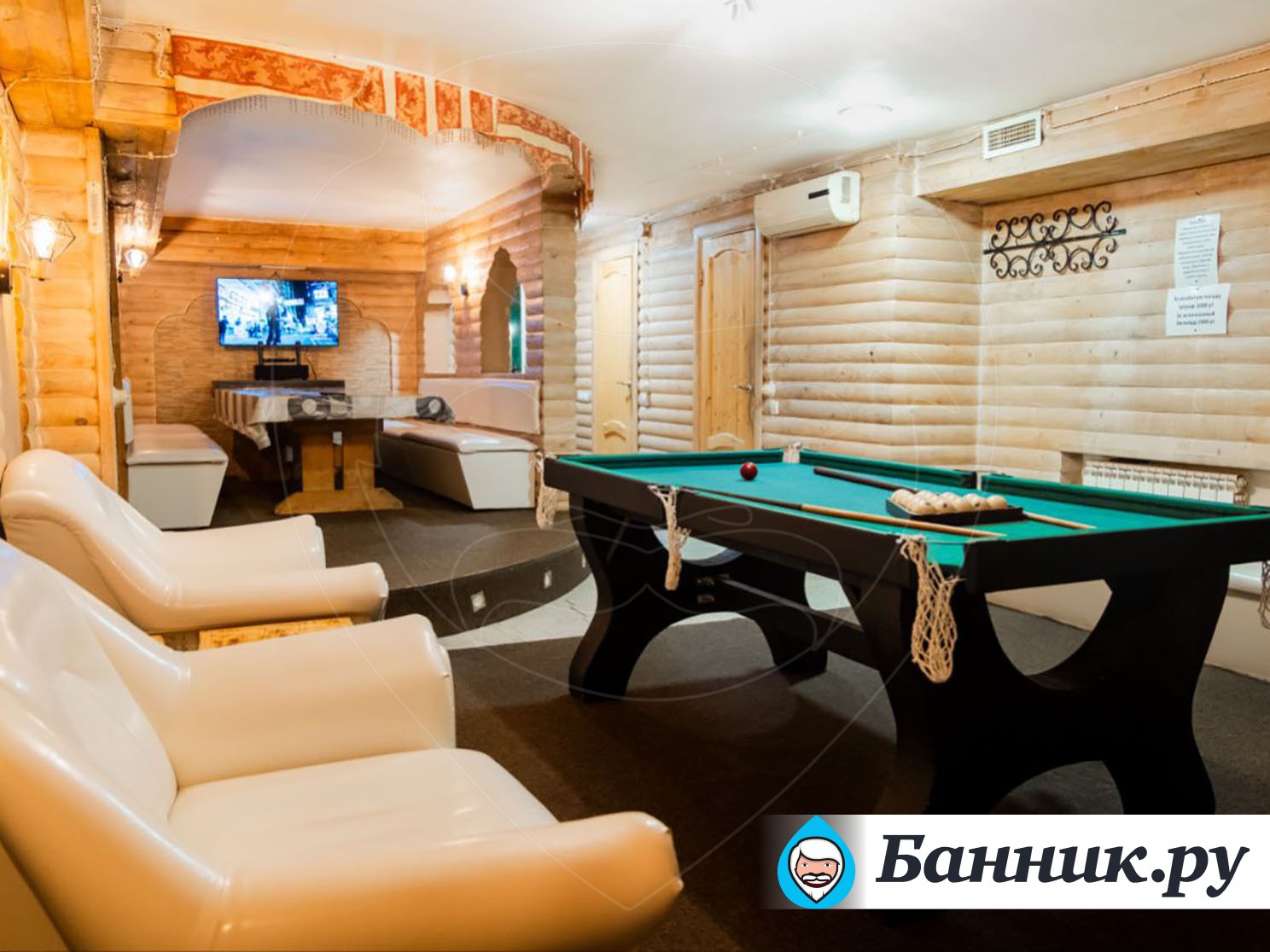 Большой зал парилка, музыка, есть бильярд.